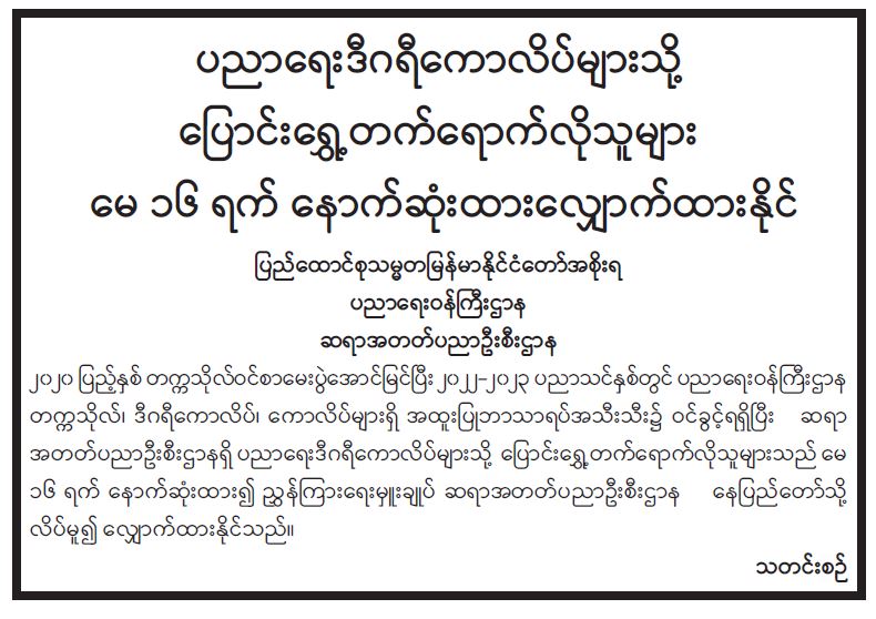 ပညာရေးဒီဂရီကောလိပ်များသို့ ပြောင်းရွှေ့တက်ရောက်လိုသူများ မေ ၁၆ ရက် နောက်ဆုံးထားလျှောက်ထားနိုင်