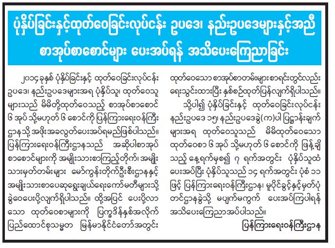 ပုံနှိပ်ခြင်းနှင့်ထုတ်ဝေခြင်းလုပ်ငန်း ဥပဒေ၊ နည်းဥပဒေများနှင့်အညီ စာအုပ်စာစောင်များ ပေးအပ်ရန် အသိပေးကြေညာခြင်း