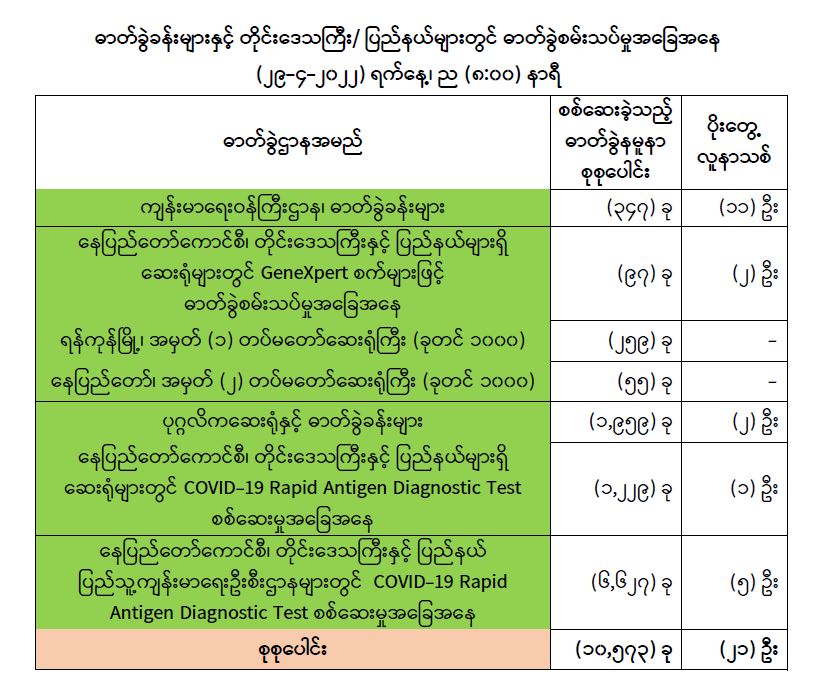 သို့ဖြစ်ပါ၍ ယနေ့အထိ ဓာတ်ခွဲနမူနာစုစုပေါင်း (၇,၉၄၆,၃၉၉) ခုအားစစ်ဆေးခဲ့ပြီး COVID-19 ဓာတ်ခွဲအတည်ပြုလူနာ စုစုပေါင်း (၆၁၂,၈၆၄) ဦး ရှိပြီ ဖြစ်ပါသည်။
