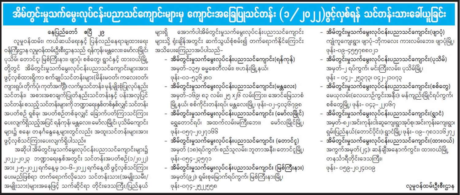 အိမ်တွင်းမှုသက်မွေးလုပ်ငန်းပညာသင်ကျောင်းများမှ ကျောင်းအခြေပြုသင်တန်း (၁/၂၀၂၂)ဖွင့်လှစ်ရန် သင်တန်းသားခေါ်ယူခြင်း 04/30/2022 အိမ်တွင်းမှုသက်မွေးလုပ်ငန်းပညာသင်ကျောင်းများမှ ကျောင်းအခြေပြုသင်တန်း (၁/၂၀၂၂)ဖွင့်လှစ်ရန် သင်တန်းသားခေါ်ယူခြင်း