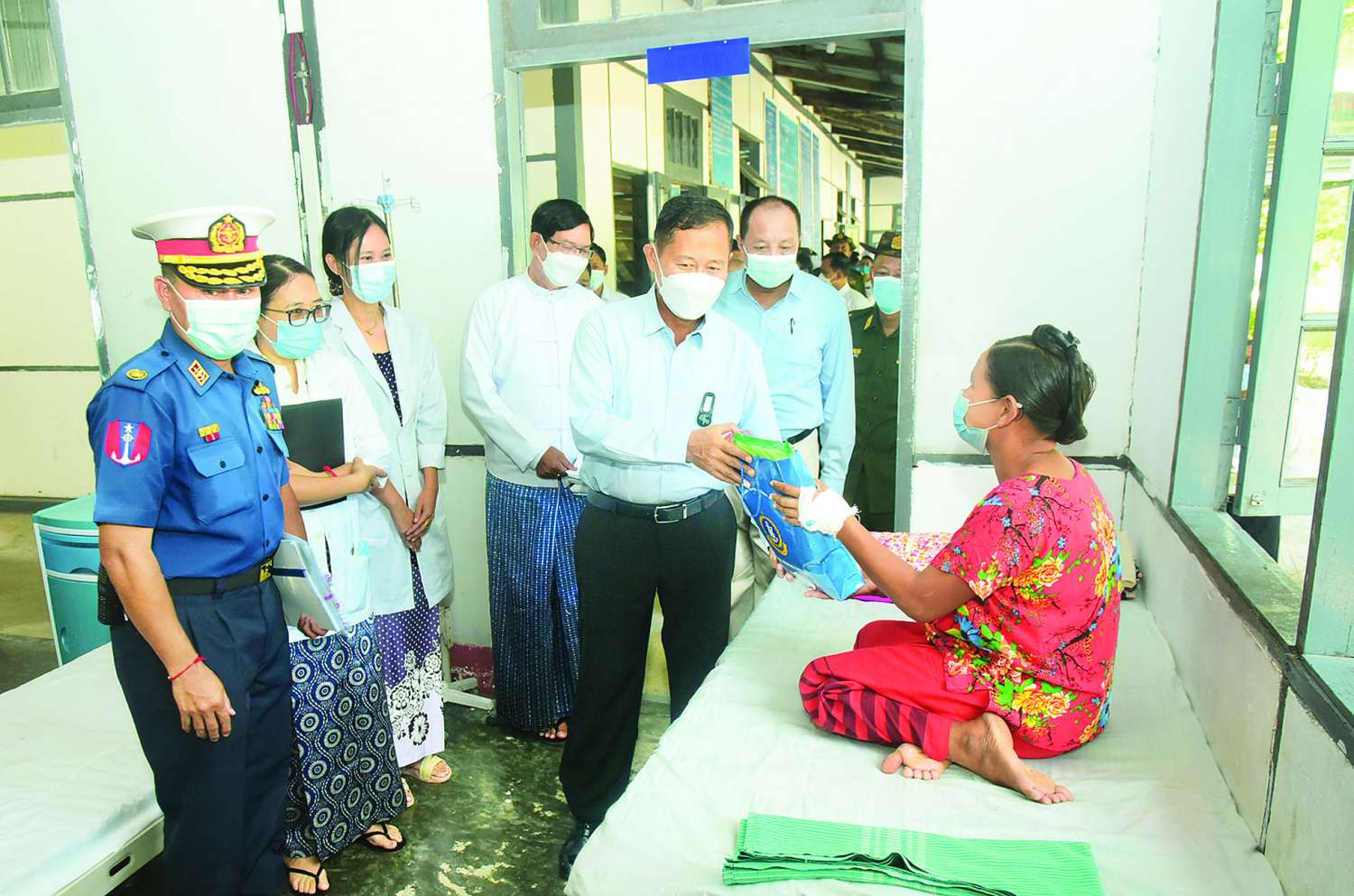 ထို့နောက် နိုင်ငံတော်စီမံအုပ်ချုပ်ရေးကောင်စီဒုတိယဥက္ကဋ္ဌ ဒုတိယတပ်မတော် ကာကွယ်ရေးဦးစီးချုပ် ကာကွယ်ရေးဦးစီးချုပ်(ကြည်း) နှင့် အဖွဲ့ဝင်များသည် ဆေးရုံရှိ ဆေးသိုလှောင်ခန်း၊ ခွဲစိတ်ခန်း၊ ဓာတ်မှန်ခန်းအပါအဝင်ဆေးရုံအတွင်း လှည့်လည်ကြည့်ရှုစစ်ဆေးပြီး လိုအပ်သည်များ ပေါင်းစပ်ညှိနှိုင်း ဆောင်ရွက်ပေးသည်။
