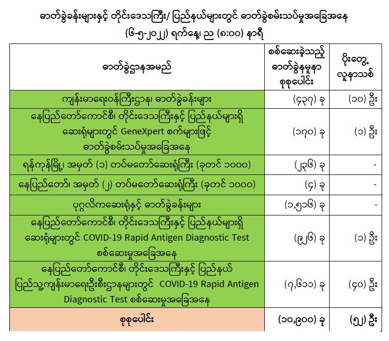 သို့ဖြစ်ပါ၍ ယနေ့အထိ ဓာတ်ခွဲနမူနာစုစုပေါင်း (၈,၀၀၉,၂၆၉) ခုအားစစ်ဆေးခဲ့ပြီး COVID-19 ဓာတ်ခွဲအတည်ပြုလူနာ စုစုပေါင်း (၆၁၃,၀၁၇) ဦး ရှိပြီ ဖြစ်ပါသည်။