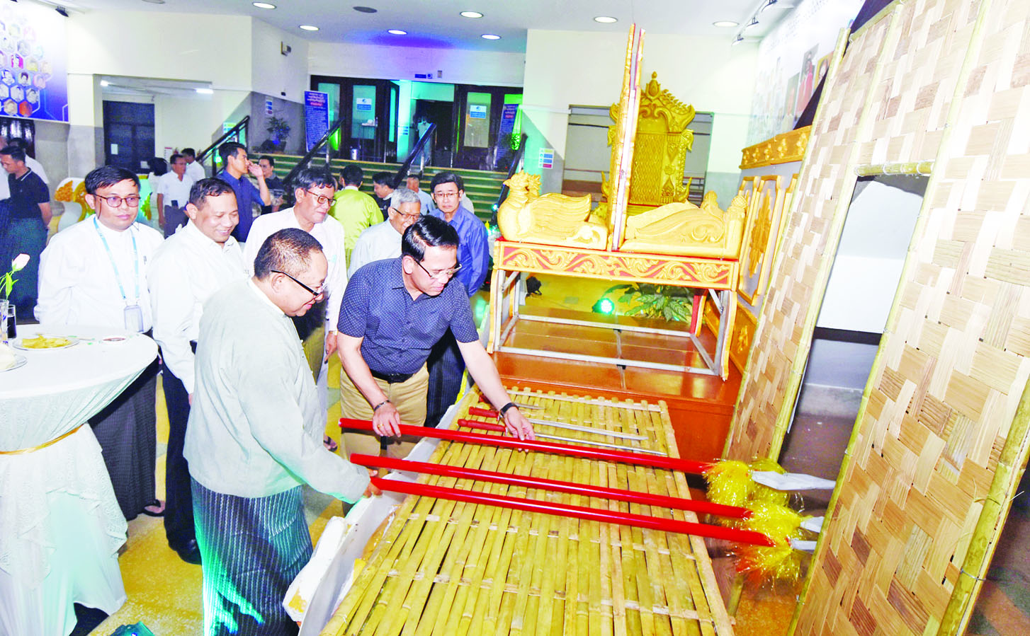 ရှေးဦးစွာ ပြည်ထောင်စုဝန်ကြီး ဦးမောင်မောင်အုန်းနှင့် မြန်မာနိုင်ငံ ရုပ်ရှင်အစည်းအရုံးဥက္ကဋ္ဌ ဦးကြည်စိုးထွန်း၊ ရုပ်ရှင်၊ သဘင်၊ ဂီတတို့မှ ပညာရှင်များ၊ အနုပညာရှင်များနှင့် ဖိတ်ကြားထားသော ဧည့်သည်တော်များက (၃၈)ဖြာ မင်္ဂလာအစီအစဉ် ရိုက်ကူးရာတွင် အသုံးပြုသည့် ဆက်တင်ပစ္စည်းများနှင့် ရုပ်ရှင်၊ သဘင်၊ ဂီတတို့မှ ပညာရှင်များ၏ ရုပ်ပုံလွှာများ ပြသထားမှုကို ကြည့်ရှုအားပေးသည်။