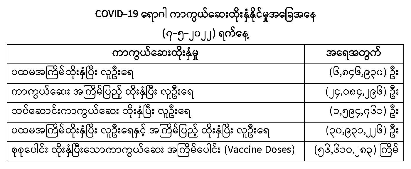 COVID-19 ရောဂါ ကာကွယ်ထိန်းချုပ်ရေးအတွက် တိုင်းဒေသကြီး/ပြည်နယ်များတွင် COVID-19 ရောဂါကာကွယ်ဆေးကို ဦးတည်အုပ်စုများသတ်မှတ်၍ ထိုးနှံပေးလျက်ရှိရာ (၇-၅-၂၀၂၂) ရက်နေ့ အထိ လူဦးရေ စုစုပေါင်း (၃၀,၉၃၁,၂၂၆) ဦးအား ထိုးနှံပေးပြီးဖြစ်၍ ပထမအကြိမ်ထိုးနှံပြီးစီးသူ (၆,၈၄၆,၉၃၀) ဦး၊ ကာကွယ်ဆေးအကြိမ်ပြည့် ထိုးနှံပြီးစီးသူ (၂၄,၀၈၄,၂၉၆) ဦးနှင့် ထပ်ဆောင်း ကာကွယ်ဆေး ထိုးနှံပြီးစီးသူ (၁,၅၉၄,၇၆၁) ဦး ရှိပြီဖြစ်ပါသည်။ သို့ဖြစ်ပါ၍ (၇-၅-၂၀၂၂) ရက်နေ့ အထိ မြန်မာနိုင်ငံတွင် COVID-19 ရောဂါကာကွယ်ဆေး အကြိမ်ရေ စုစုပေါင်း (၅၆,၆၁၀,၂၈၃) ကြိမ် ထိုးနှံပြီး ဖြစ်ပါသည်။