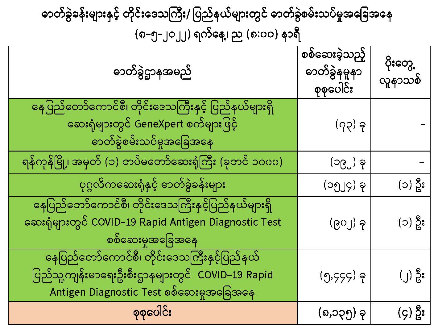 သို့ဖြစ်ပါ၍ ယနေ့အထိ ဓာတ်ခွဲနမူနာစုစုပေါင်း (၈,၀၂၄,၉၈၄) ခုအားစစ်ဆေးခဲ့ပြီး COVID-19 ဓာတ်ခွဲအတည်ပြုလူနာ စုစုပေါင်း (၆၁၃,၀၅၃) ဦး ရှိပြီ ဖြစ်ပါသည်။
