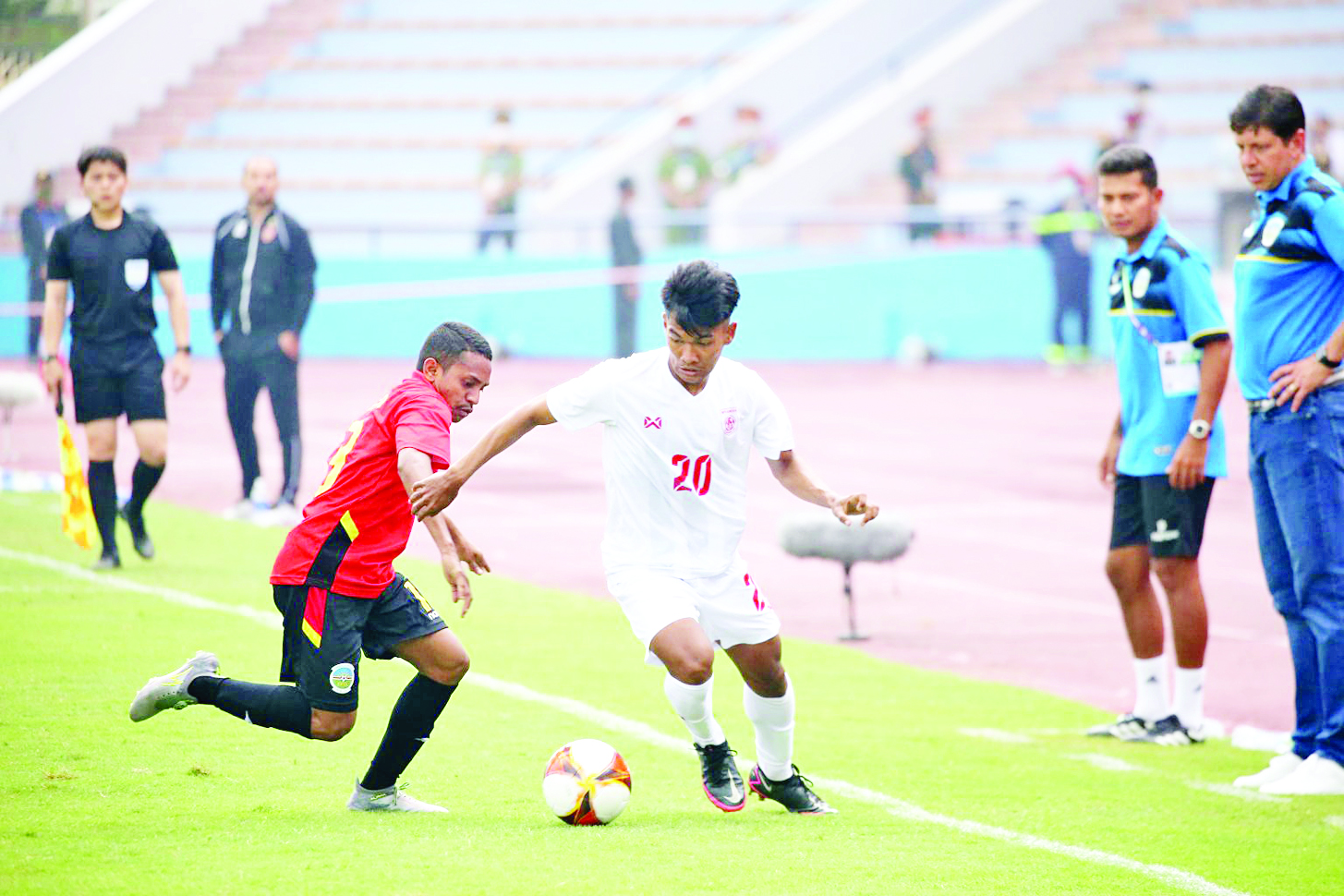 ဗီယက်နမ်နိုင်ငံက အိမ်ရှင်အဖြစ် လက်ခံကျင်းပလျက်ရှိသည့် (၃၁)ကြိမ်မြောက် ဆီးဂိမ်းအမျိုးသား ဘောလုံးပြိုင်ပွဲ အုပ်စု (က) ပထမနေ့ကို မေ ၈ ရက်က ဆက်လက်ကျင်းပရာ မြန်မာ အသင်းက တီမောအသင်းကို သုံးဂိုး-နှစ်ဂိုးဖြင့် အနိုင်ရခဲ့သည်။