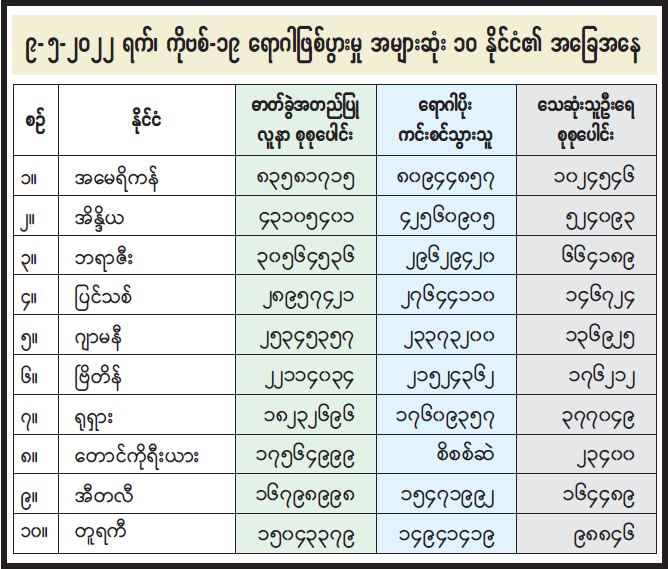 ၉- ၅-၂၀၂၂ ရက်၊ ကိုဗစ်-၁၉ ရောဂါဖြစ်ပွားမှု အများဆုံး ၁၀ နိုင်ငံ၏ အခြေအနေ