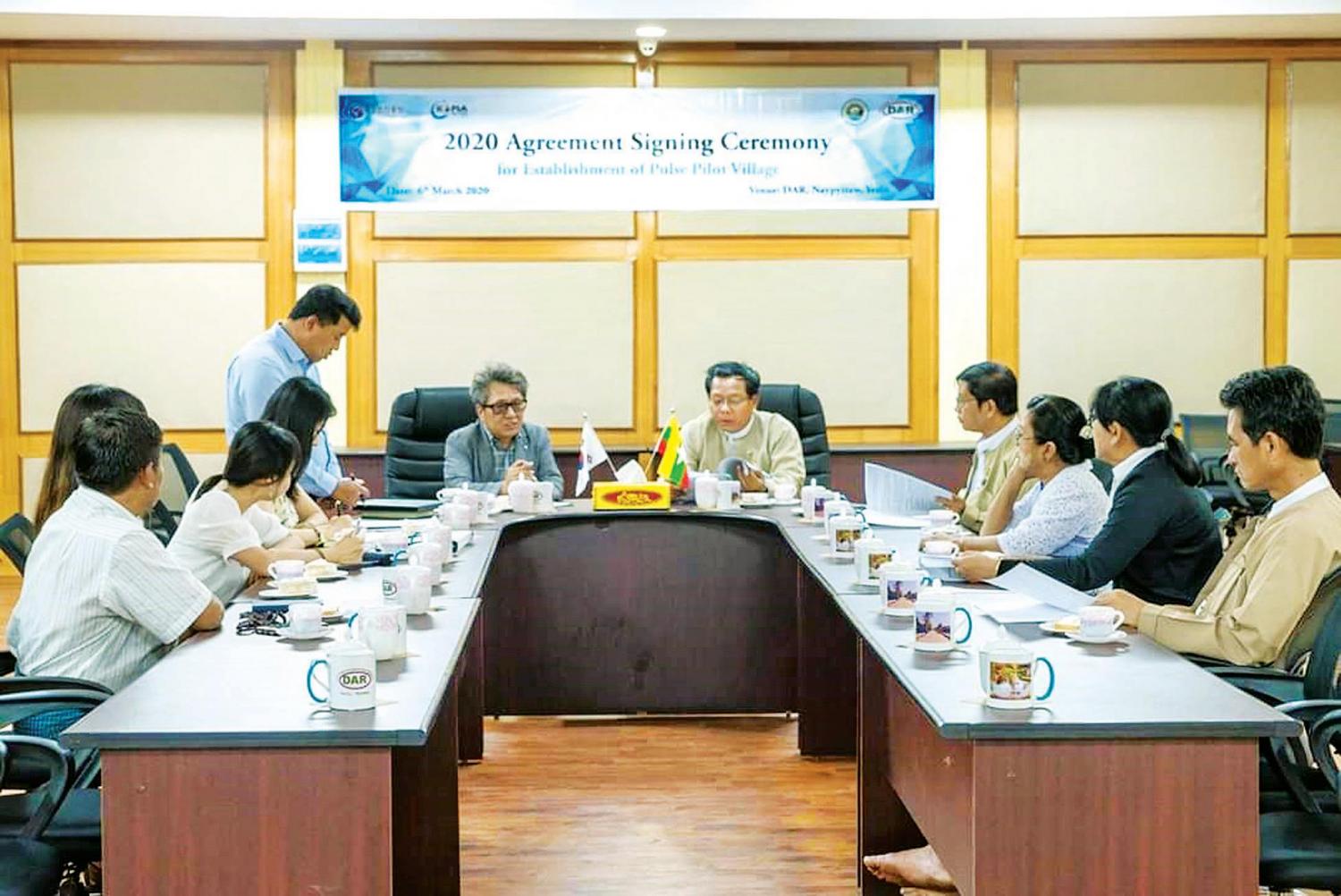 ပဲမျိုးစုံစိုက်ပျိုးထုတ်လုပ်မှု စံပြကျေးရွာသစ် ထူထောင်ရေးအတွက် ကိုရီးယားအပြည်ပြည်ဆိုင်ရာ ပူးပေါင်းဆောင်ရွက်မှုအဖွဲ့နှင့် စိုက်ပျိုးရေးသုတေသန ဦးစီးဌာနတို့ သုတေသနအကျိုးတူ ပူးပေါင်းဆောင်ရွက်မှု နားလည်မှုစာချွန်လွှာ လက်မှတ်ရေးထိုးခြင်း အခမ်းအနားကို မတ် ဒုတိယပတ်က ရေဆင်း - စိုက်ပျိုးရေးသုတေသနဦးစီးဌာန နဝရတ်ခန်းမ၌ ကျင်းပရာ အခမ်းအနားသို့ စိုက်ပျိုးရေးသုတေသနဦးစီးဌာန ညွှန်ကြားရေးမှူးချုပ် ဒေါက်တာ နိုင်ကြည်ဝင်း၊ ဒုတိယညွှန်ကြားရေးမှူးချုပ် ဒေါက်တာ သန့်လွင်ဦး၊ ညွှန်ကြားရေးမှူး ဒေါက်တာထွန်းရွှေ၊ ဌာနစုတာဝန်ခံများ၊ သုတေသနပညာရှင်များ၊ KOPIA မှ Dr. Kim Dae Ho နှင့် တာဝန်ရှိသူများ တက်ရောက်ကြသည်။