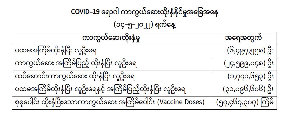 COVID-19 ရောဂါ ကာကွယ်ထိန်းချုပ်ရေးအတွက် တိုင်းဒေသကြီး/ပြည်နယ်များတွင် COVID-19 ရောဂါကာကွယ်ဆေးကို ဦးတည်အုပ်စုများသတ်မှတ်၍ ထိုးနှံပေးလျက်ရှိရာ (၁၄-၅-၂၀၂၂) ရက်နေ့အထိ လူဦးရေစုစုပေါင်း (၃၁,၀၉၆,၆၀၆) ဦးအား ထိုးနှံပေးပြီးဖြစ်၍ ပထမအကြိမ်ထိုးနှံ ပြီးစီးသူ (၆,၄၉၇,၅၅၈) ဦး၊ ကာကွယ်ဆေးအကြိမ်ပြည့် ထိုးနှံပြီးစီးသူ (၂၄,၅၉၉,၀၄၈) ဦးနှင့် ထပ်ဆောင်း ကာကွယ်ဆေး ထိုးနှံပြီးစီးသူ (၁,၇၇၁,၆၅၃) ဦး ရှိပြီဖြစ်ပါသည်။ သို့ဖြစ်ပါ၍ (၁၄-၅-၂၀၂၂) ရက်နေ့အထိ မြန်မာနိုင်ငံတွင် COVID-19 ရောဂါကာကွယ်ဆေးအကြိမ်ရေ စုစုပေါင်း (၅၇,၄၆၇,၃၀၇) ကြိမ် ထိုးနှံပြီးဖြစ်ပါသည်။