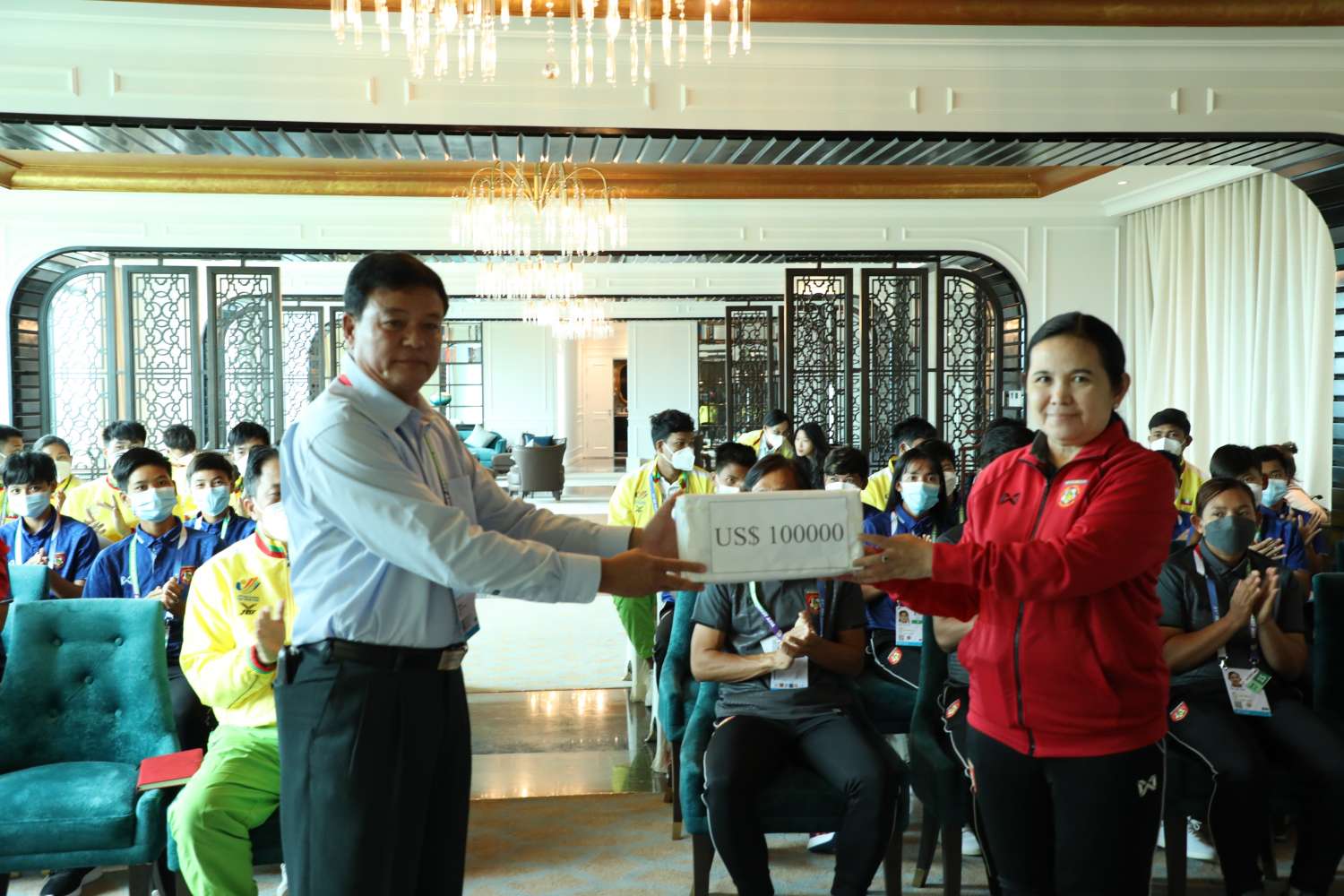 တွေ့ဆုံစဉ် ပြည်ထောင်စုဝန်ကြီးက မြန်မာတို့၏မဆုတ်မနစ်သော ဇွဲ၊ လုံ့လ ကြိုးစားအားထုတ်မှုကို ပြသယှဉ်ပြိုင်သွားကြရန်၊ အားကစားဖြင့် နိုင်ငံတော်၏ဂုဏ်ကို မြှင့်တင်ကြရန်နှင့် အောင်မြင်မှုရရှိသည်နှင့်အမျှ နိုင်ငံတော်နှင့် ပြည်သူတစ်ရပ်လုံးက စောင့်မျှော်အားပေး ဂုဏ်ပြုကြမည်ဖြစ်ကြောင်း ပြောကြားပြီး အကြိုဗိုလ်လုပွဲသို့ တက်ရောက်သွားသည့် မြန်မာအမျိုးသမီး ဘောလုံးအသင်းကို နိုင်ငံတော်မှ ချီးမြှင့်ငွေ အမေရိကန်ဒေါ်လာ တစ်သိန်း ပေးအပ်သည်။