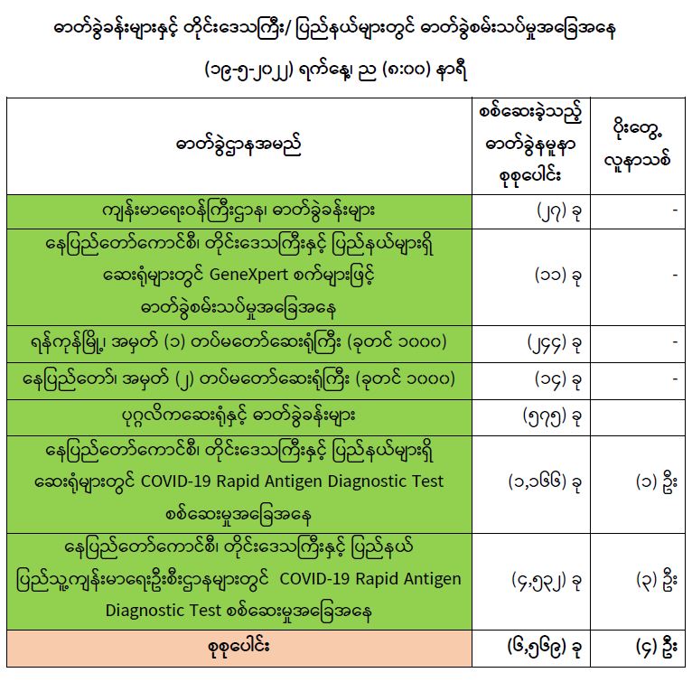 သို့ဖြစ်ပါ၍ ယနေ့အထိ ဓာတ်ခွဲနမူနာစုစုပေါင်း (၈,၁၁၆,၇၈၂) ခုအားစစ်ဆေးခဲ့ပြီး COVID-19 ဓာတ်ခွဲအတည်ပြုလူနာ စုစုပေါင်း (၆၁၃,၁၈၆) ဦး ရှိပြီဖြစ်ပါသည်။