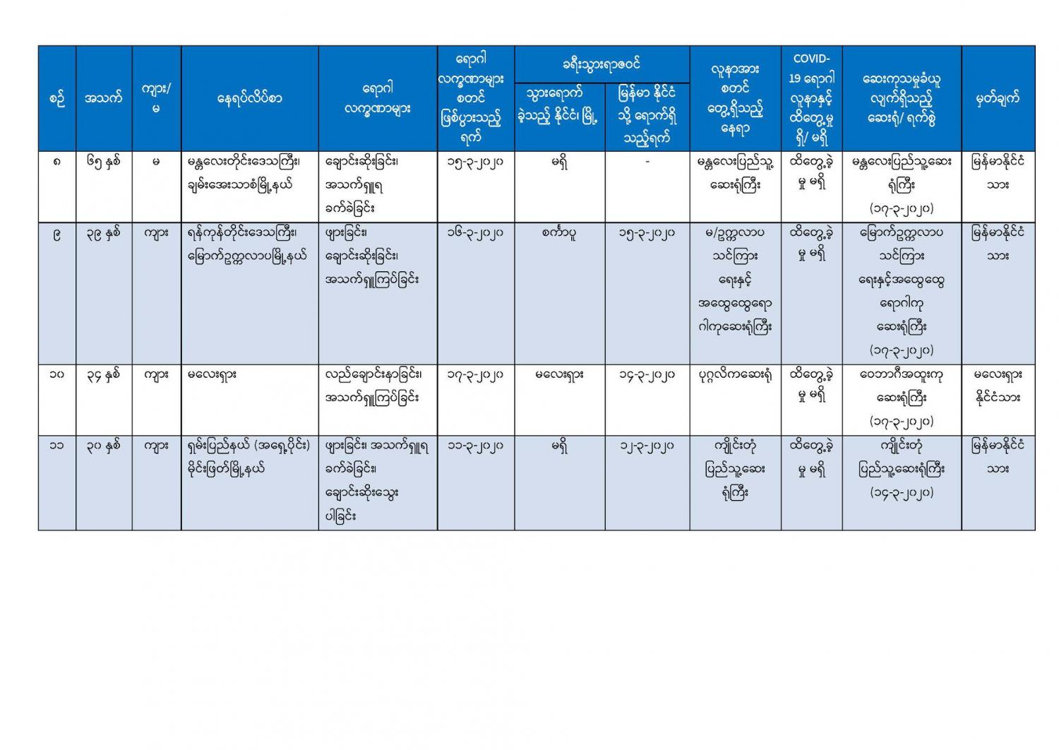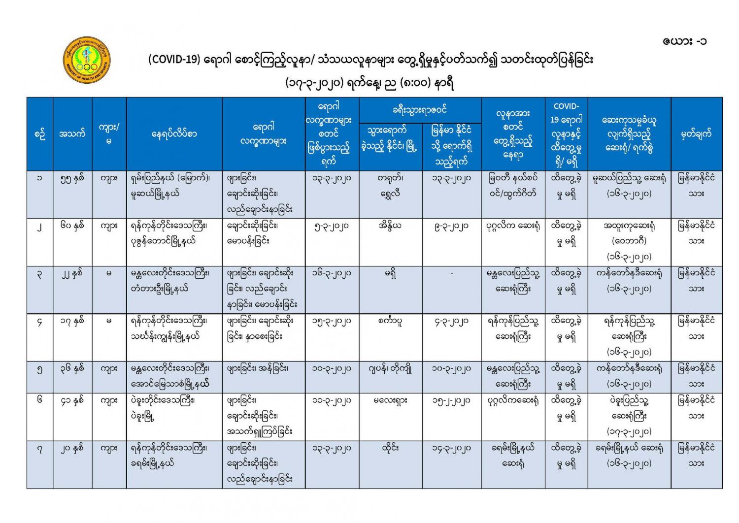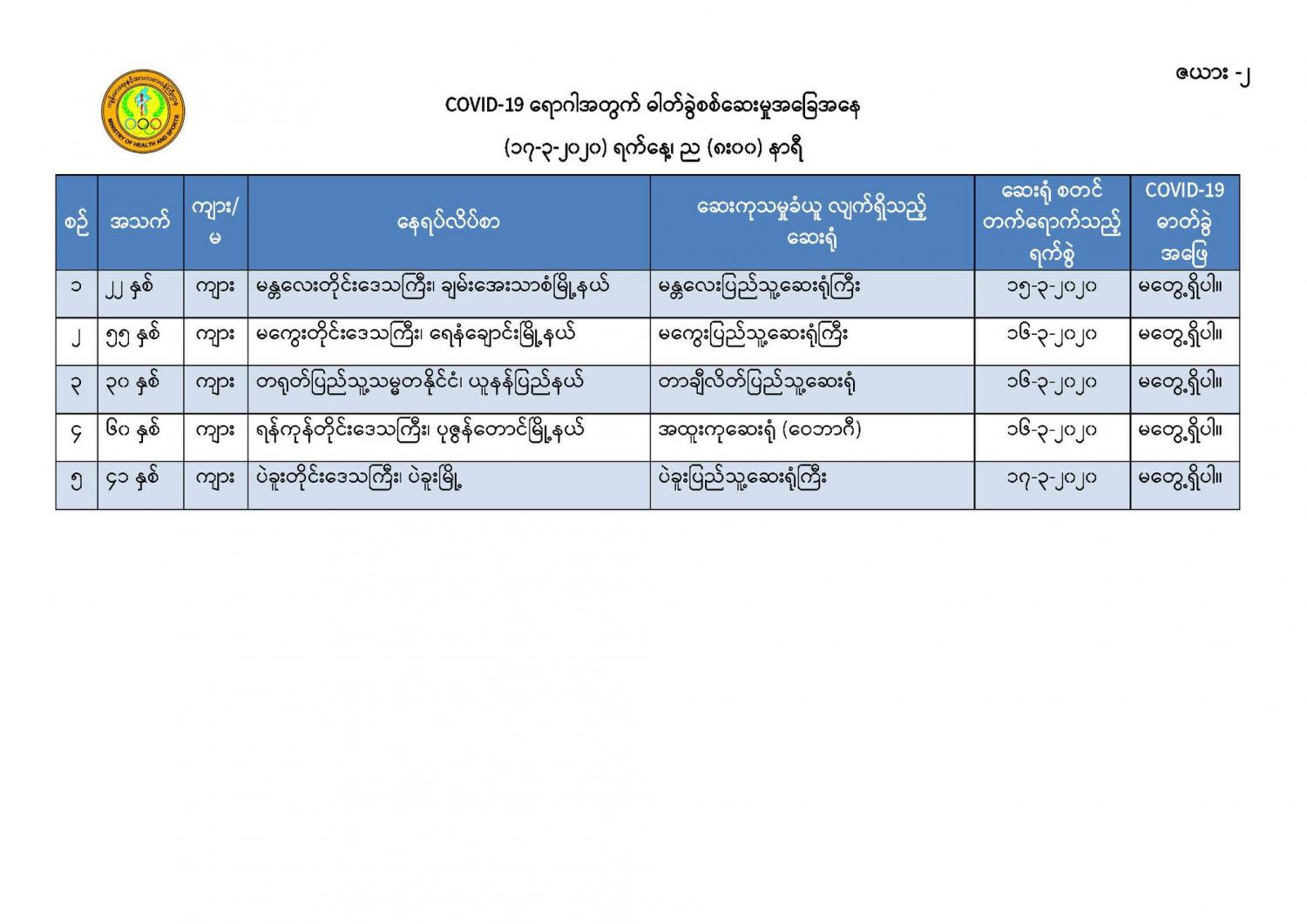 ၅။ မန္တလေးတိုင်းဒေသကြီး၊ တံတားဦးမြို့နယ်တွင် နေထိုင်သော အသက် (၂၅) နှစ်အရွယ် အမျိုးသမီး တစ်ဦးသည် လည်ချောင်းနာခြင်း၊ အန်ခြင်း၊ အစာမစားနိုင်ခြင်း စသည့် လက္ခဏာများဖြင့် တောင်ပြုံး တိုက်နယ်ဆေးရုံတွင် (၁၄-၃-၂၀၂၀) ရက်နေ့၊ နံနက် (၉:၀၀) နာရီအချိန်တွင် တက်ရောက်ကုသခဲ့ပြီး လူနာမှာ သက်သာမှု မရှိသဖြင့် မန္တလေးအထွေထွေရောဂါကုဆေးရုံကြီးသို့ လွှဲပြောင်းညွှန်းပို့ခဲ့ရာ လူနာတွင် မောခြင်း၊ အသက်ရှူကြပ်ခြင်း စသည့်လက္ခဏာများ တွေ့ရှိရသဖြင့် စောင့်ကြည့်လူနာ အဖြစ်သတ်မှတ်၍ (၁၇-၃-၂၀၂၀) ရက်နေ့၊ နံနက် (၂:၀၀) နာရီအချိန်တွင် ကန်တော်နဒီဆေးရုံသို့ ထပ်မံညွှန်းပို့ခဲ့ပါသည်။ အဆိုပါလူနာထံမှ ဓာတ်ခွဲနမူနာရယူ၍ အမျိုးသား ကျန်းမာရေးဓာတ်ခွဲမှု ဆိုင်ရာဌာန (ရန်ကုန်) သို့ ပေးပို့ထားရှိပြီး လိုအပ်သော ဆေးကုသမှုများ ဆောင်ရွက်စဉ် နံနက် (၇:၃၀) နာရီအချိန်တွင် သေဆုံးသွားခဲ့ကြောင်း သိရှိရပါသည်။ သေဆုံးရသည့် အကြောင်းအရင်းမှာ လူနာ၏ ရောဂါရာဇဝင်နှင့် သွေးစစ်ချက်အဖြေများအရ သွေးဆိပ်တက်ခြင်း၏ နောက်ဆက်တွဲဆိုးကျိုး များကြောင့် ဖြစ်နိုင်ကြောင်း သိရှိရပါသည်။ အဆိုပါ လူနာ၏ ဓာတ်ခွဲနမူနာ အဖြေရရှိလျှင် အချိန်နှင့် တစ်ပြေးညီ ထပ်မံထုတ်ပြန်သွားမည် ဖြစ်ပါသည်။