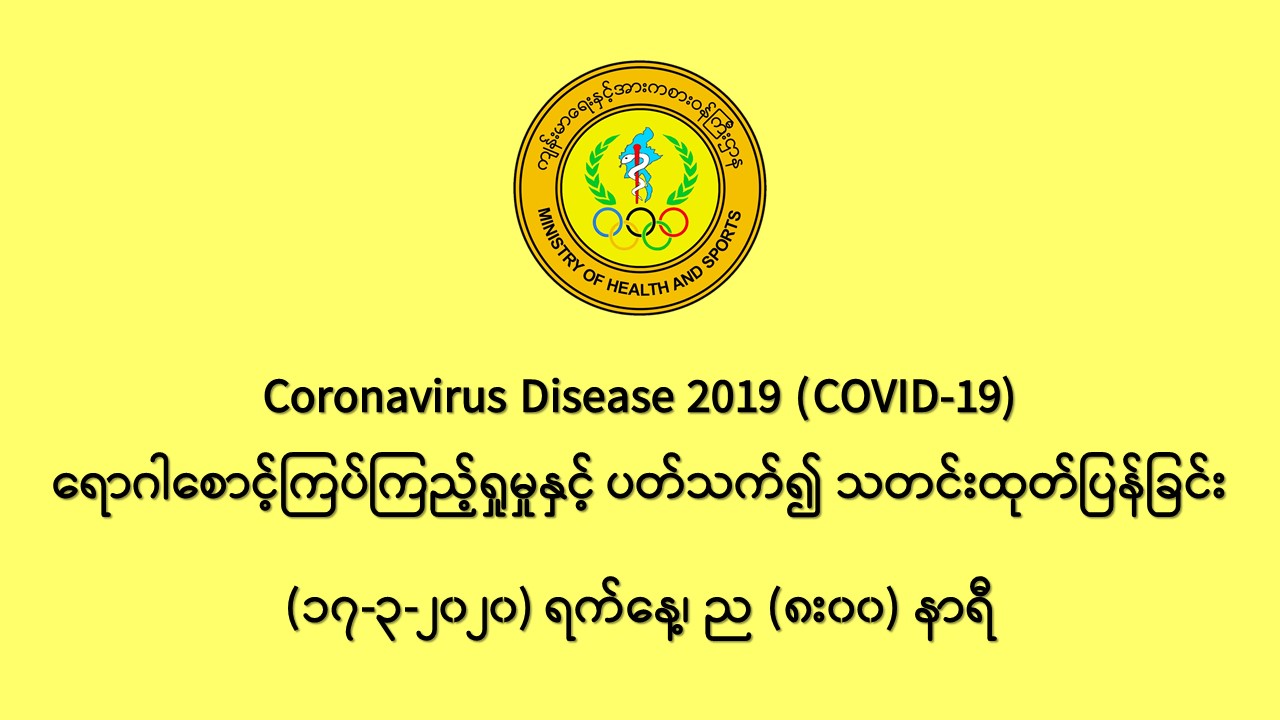 ၆။ (၁၇-၃-၂၀၂၀) ရက်နေ့အထိ မြန်မာနိုင်ငံတွင် COVID-19 ရောဂါ ဓာတ်ခွဲအတည်ပြုလူနာ မတွေ့ရှိ သေးသော်လည်း ရောဂါစောင့်ကြပ်ကြည့်ရှုခြင်းလုပ်ငန်းများကို အရှိန်အဟုန်မြှင့်၍ ဆောင်ရွက်လျက် ရှိပါသည်။ ယခုအခါ တရုတ်ပြည်သူ့သမ္မတနိုင်ငံနှင့် အိမ်နီးချင်းနိုင်ငံအချို့ အပါအဝင် ကမ္ဘာ့နိုင်ငံ (၁၅၁) နိုင်ငံတွင် COVID-19 ရောဂါ ကူးစက်ဖြစ်ပွားလျက်ရှိသဖြင့် ပြည်သူလူထုအနေ ဖြင့် ကျန်းမာရေးနှင့် အားကစားဝန်ကြီးဌာနမှ ထုတ်ပြန်ထားသော ရောဂါကာကွယ်ရေးဆိုင်ရာ ကျန်းမာရေး အသိပညာပေး အချက်အလက်များအား တိကျစွာလိုက်နာဆောင်ရွက်ရန် နှိုးဆော်အပ်ပါသည်။