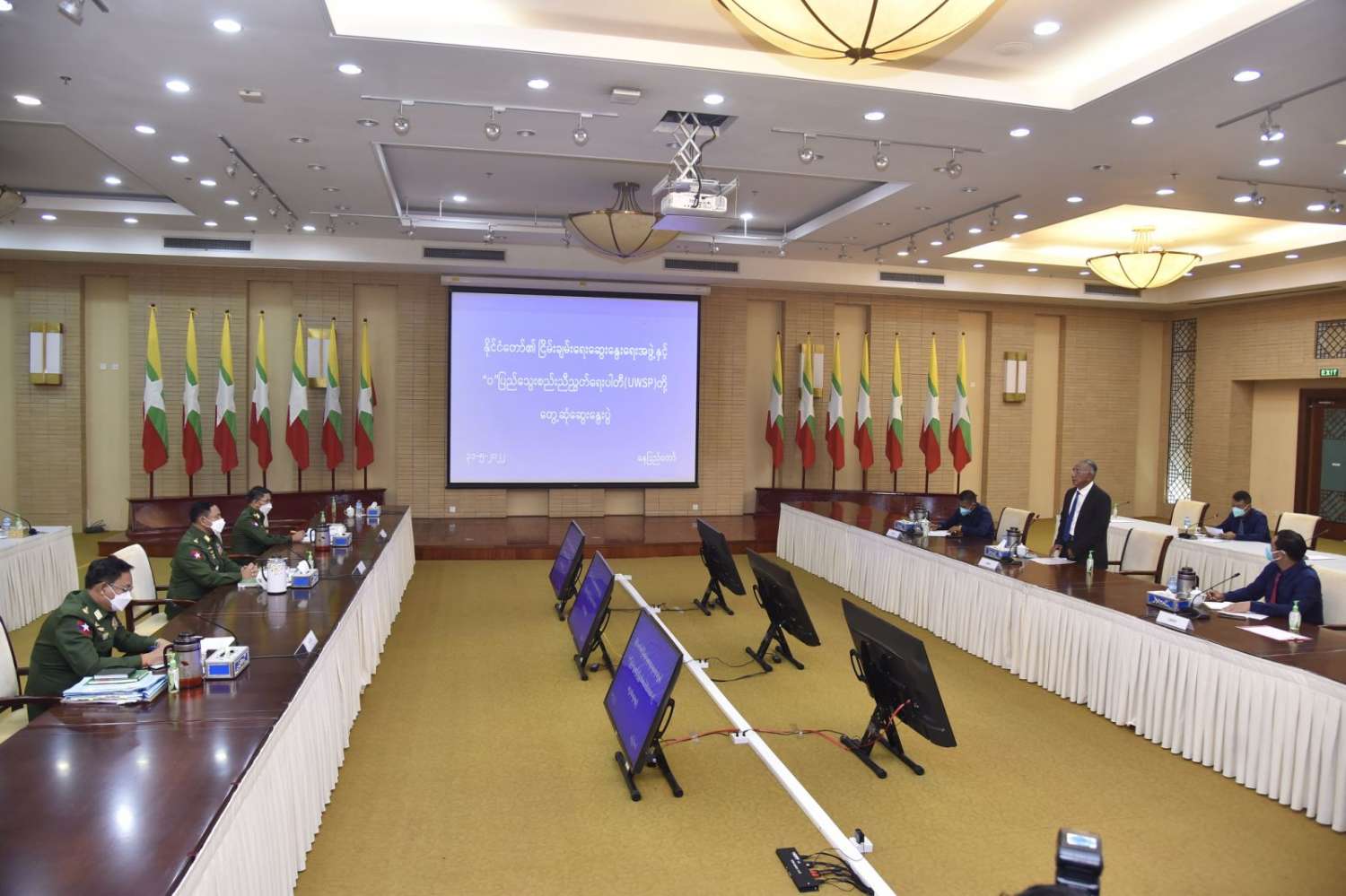 နိုင်ငံတော်၏ ငြိမ်းချမ်းရေးဆွေးနွေးရေးအဖွဲ့နှင့် “ဝ” ပြည်သွေးစည်းညီညွတ်ရေးပါတီ (UWSP) ဒုတိယဥက္ကဋ္ဌ ဦးဆောင်သော ကိုယ်စားလှယ်အဖွဲ့တို့ တွေ့ဆုံဆွေးနွေးပွဲကို ယနေ့နံနက်ပိုင်းတွင် နေပြည်တော်ရှိ အမျိုးသားစည်းလုံးညီညွတ်ရေးနှင့် ငြိမ်းချမ်းရေး ဖော်ဆောင်မှုဗဟိုဌာန အစည်းအဝေးခန်းမ၌ ကျင်းပသည်။