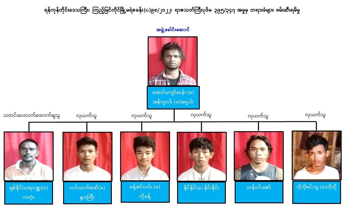 ထို့နောက် အမှုစစ်အဖွဲ့က ပြစ်မှုကျူးလွန်ရာတွင် ပါဝင်သည်ဟု သံသယရှိသူ ဓားပြတိုက်ခံရသည့် နေအိမ်၌ ဖွင့်လှစ်ထားသည့် “အောင်” Car Aircon Service လုပ်ငန်း၌ အလုပ်လုပ်ကိုင်နေသည့် ဒလမြို့နယ်နေ ချစ်နိုင်(ခ) ရာဂျူး(ခ) ကတုံးအား ယင်းနေ့ညနေပိုင်း၌ ဖမ်းဆီးစစ်ဆေးခဲ့ရာ ၎င်း၏ ပူးပေါင်းပါဝင်မှုဖြင့် ဓားပြတိုက်မှုအား ဒလမြို့နယ်၊ ကမာကဆစ်ရပ်ကွက်၊ ကျန်စစ်သား (၄)လမ်း၊ အမှတ်(၂၉၉)နေ ၎င်း၏ဦးလေးတော်စပ်သူ အောင်ကျော်ဆန်း (ခ) အန်ကူးပါး (ခ) အငူပါးမှ ဦးဆောင်၍ ကျူးလွန်ခဲ့ခြင်းဖြစ်ကြောင်း ဖော်ထုတ်သိရှိရသဖြင့် ပြစ်မှုကျူးလွန်သူများအား ဖော်ထုတ်ဖမ်းဆီးရမိနိုင်ရေး ဆက်လက်ဆောင်ရွက်ခဲ့ရာ အောင်ကျော်ဆန်း (ခ) အန်ကူးပါး(ခ) အငူပါးအား မေလ ၃၁ ရက် ညနေ ၅ နာရီ ၁၅ မိနစ်အချိန်တွင် သာကေတမြို့နယ်၊ (၁၄)ရပ်ကွက်၊ သလ္လာဝတီ(၂)လမ်းရှိ ဓားပြတိုက်မှု ကျူးလွန်ရာတွင် ပါဝင်ခဲ့သူ လင်းထက်ဇဏ်(ခ) နွားကြီး (၁၉)နှစ်၏ နေအိမ်၌ လင်းထက်ဇဏ်(ခ) နွားကြီး၊ စက်မြေရပ်ကွက်နေ ခန့်ဇင်လင်း(ခ) ကိုခန့် (၁၈)နှစ်၊ မှော်စက်ရပ်ကွက်နေ နိုင်နိုင်(ခ) နိုင်းနိုင်း (၂၀) နှစ်တို့ ၃ ဦးနှင့်အတူ ဖမ်းဆီးရမိခဲ့သည်။