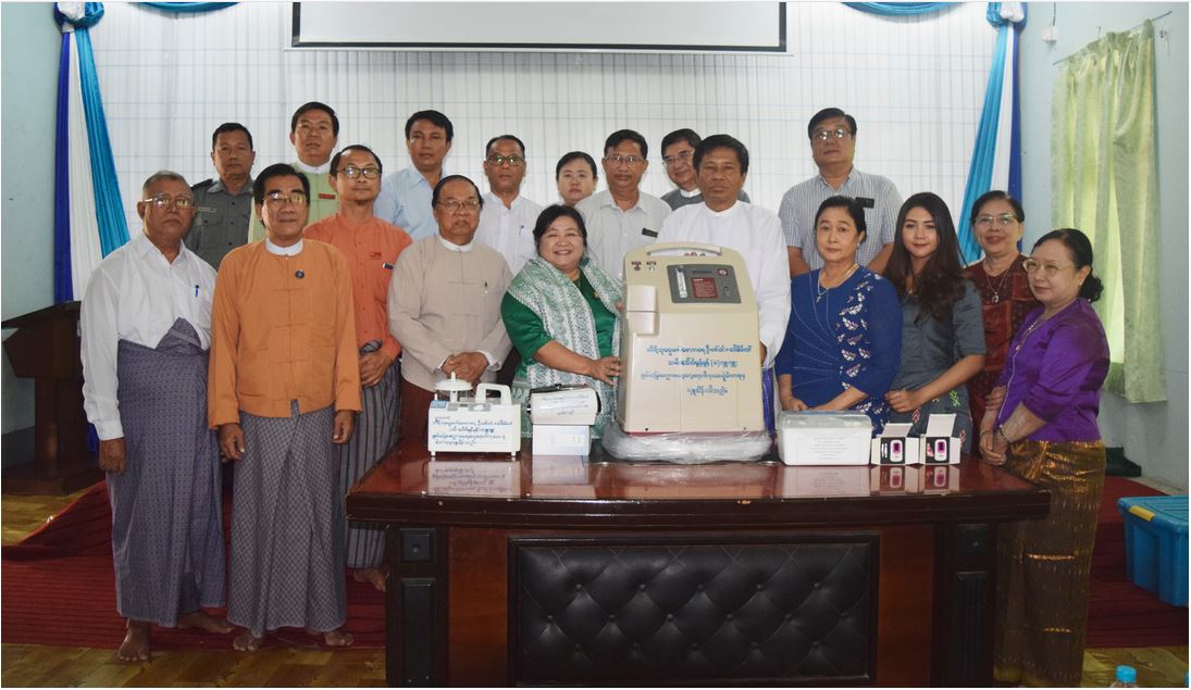 COVID-19 ရောဂါ ကာကွယ်ရေးနှင့် ကုသရေးလုပ်ငန်းများ ဆောင်ရွက်နိုင်ရန် သန်လျင်မြို့ အထွေထွေ ရောဂါကုဆေးရုံကြီးသို့ ငွေကျပ် ၁၁၁ သိန်းကျော်တန်ဖိုးရှိ ဆေးရုံသုံး ပစ္စည်း ၉ မျိုး လှူဒါန်းပွဲကို သီရိသုဓမ္မ မဏိဇောတဓရ ဦးဇော်ဝင်း(ဥက္ကဋ္ဌ၊ ဇော်ထက်ပိုင် အင်ဂျင်နီယာ နှင့် ဆောက်လုပ်ရေး ကုမ္ပဏီအုပ်စု) + ဒေါ်မိမိတင် (ချမ်းမြေ့မေတ္တာအထူးကုဆေးရုံ)၊ သမီး မအိမွန်မွန် (CEO ချမ်းမြေ့မေတ္တာ အထူးကုဆေးရုံ - သန်လျင်)တို့က ဆေးရုံအုပ်ကြီး ဒေါက်တာချိုချိုလွင်နှင့် တာဝန်ရှိသူများထံ ပေးအပ်လှူဒါန်းသည်။