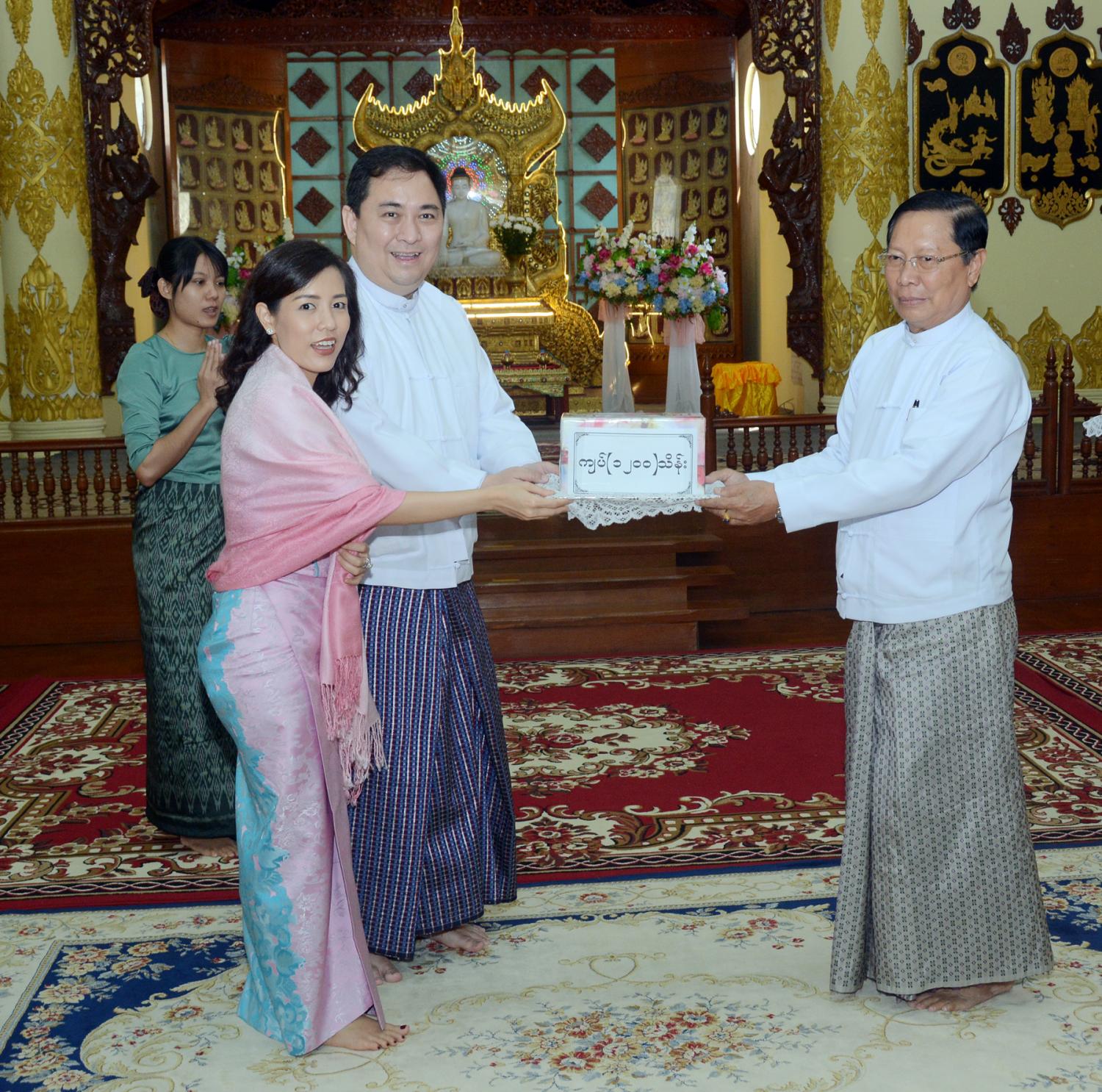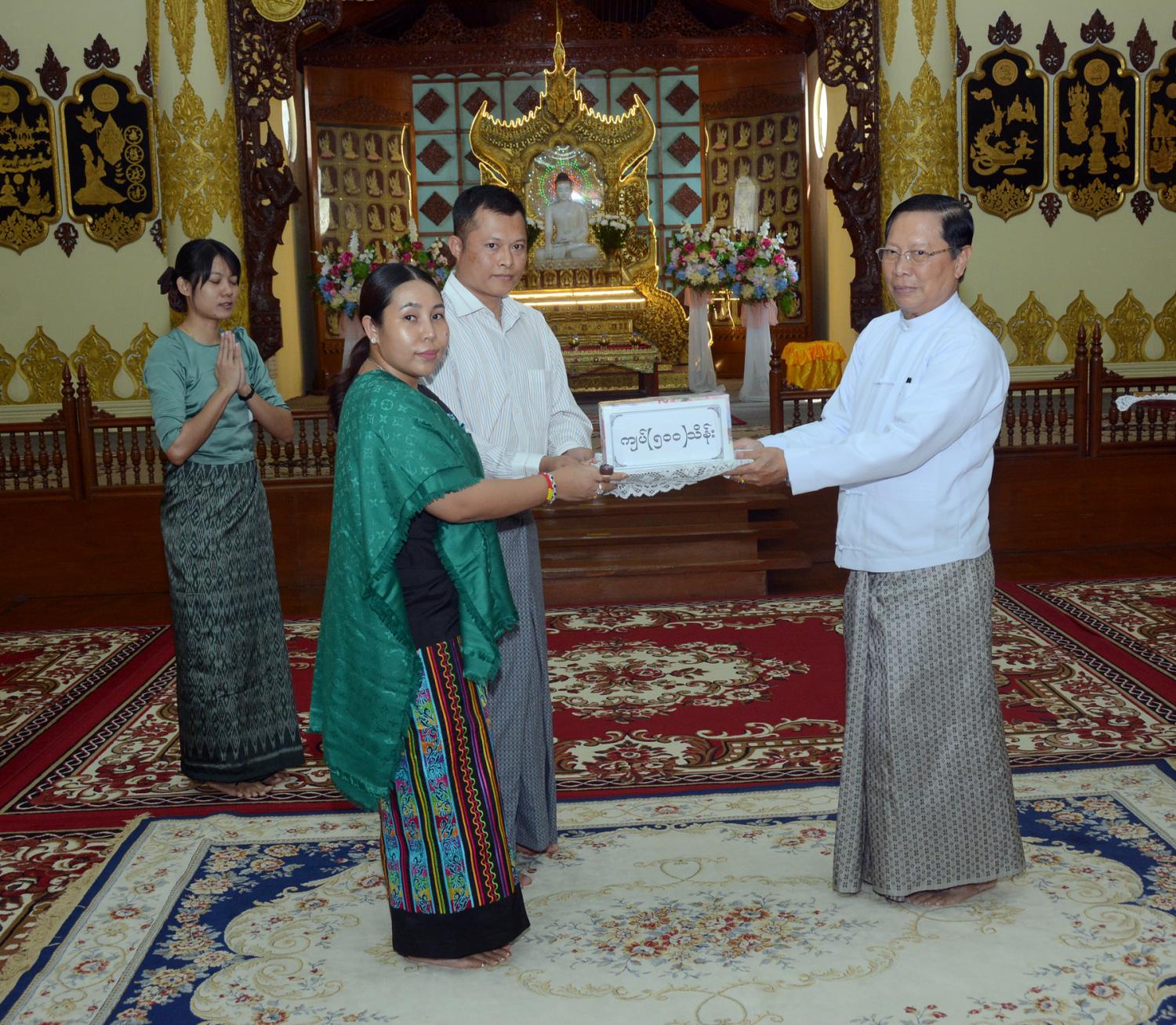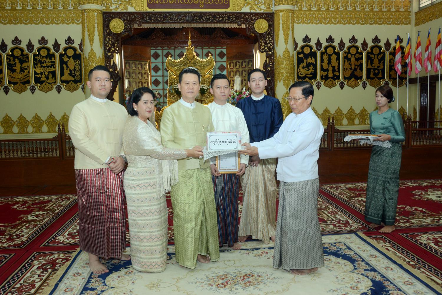 အလှူတော်ငွေပေးအပ်လှူဒါန်းပွဲ အခမ်းအနားတွင် Fuxing Brothers Group of Companies ဥက္ကဋ္ဌ ဦးအိုင်ထွန်း+သုဓမ္မသိင်္ဂီ ဒေါ်နန်းခင်ညွန့် မိသားစုက ထာဝရ ငြိမ်းချမ်းရေး စေတီတော် ဘက်စုံ မွမ်းမံ တည်ဆောက်ရေးနှင့် အချော သတ်လုပ်ငန်းများ ဆောင်ရွက်ရန်အတွက် အလှူငွေ ကျပ်သိန်း ၃၃၂၀ နှင့် နယ်စပ်တောင်တန်းဒေသ သာသနာပြု လုပ်ငန်းများ အတွက် အလှူငွေကျပ် သိန်း ၃၀၀ ၊ အဂ္ဂမဟာသီရိသုဓမ္မ မဏိဇောတဓရ ဦးဇော်မိုးခိုင် + ဒေါက်တာစောနေနွယ် (AA Medical Products Co., Ltd.) မိသားစုက ထာဝရ ငြိမ်းချမ်း ရေးစေတီတော် ဘက်စုံမွမ်းမံတည်ဆောက်ရေးနှင့် အချောသတ်လုပ်ငန်းများ ဆောင်ရွက်ရန် အတွက် အလှူငွေကျပ် သိန်း ၁၂၀၀ နှင့် နယ်စပ်တောင်တန်းဒေသ သာသနာပြု လုပ်ငန်းများအတွက် အလှူ ငွေကျပ် သိန်း ၃၅၀ တို့ကိုလည်းကောင်း၊ ထာဝရငြိမ်းချမ်းရေးစေတီတော် ဘက်စုံမွမ်းမံ တည်ဆောက်ရေး နှင့် အချောသတ် လုပ်ငန်းများ ဆောင်ရွက်ရန် အတွက် ဦးဝင်းဖေ + ဒေါ်ရွှေချော၊ သမီး သီရိသုဓမ္မသိင်္ဂီ ဒေါ်နီလာ၊ သီဟသုဓမ္မသိင်္ဂီ ဒေါ်နန်းဝါ မိသားစုက အလှူငွေကျပ် သိန်း ၁၀၀၀ ၊ သီရိသုဓမ္မမဏိဇောတဓရ ဦးမိုးအား အမှူးထား၍ ဗိုလ်မှူး ကျော်ကိုကိုရှိန်း+ မမိုးပြည့်ပြည့်ဖြိုး မိသားစု(မုံရွာဆရာမိုး တိုင်းရင်းဆေးဝါး ထုတ်လုပ် ရေးနှင့် KS Diamond ရတနာဆိုင်) က အလှူငွေကျပ် သိန်း ၅၀၀ ၊ SME Development Bank ဒုတိယဥက္ကဋ္ဌ ဒေါက်တာ ဇေယျာညွန့် + သီရိသုဓမ္မသိင်္ဂီ ဒေါ်အိသန္တာဘို မိသားစုက အလှူငွေကျပ် သိန်း ၂၀၀ ၊ သီဟ သုဓမ္မသိင်္ဂီ ဒေါ်ပိုးအိဖြူမောင် (ပြည့်ဝခိုင်မာ ဆောက် လုပ်ရေးကုမ္ပဏီ)က အလှူငွေကျပ် သိန်း ၁၀၀ နှင့် ဦးဇော်မင်းခိုင် + ဒေါ်ဥမ္မာခိုင် မိသားစု(မြန်မာ့ရိုးရာစက်မှု လက်မှုကုမ္ပဏီလီမိတက်)က အလှူငွေ ကျပ် သိန်း ၅၀ တို့ကိုလည်း ကောင်းပေးအပ်လှူဒါန်းကြရာ သာသနာရေးနှင့် ယဉ်ကျေးမှုဝန်ကြီးဌာန ပြည်ထောင်စု ဝန်ကြီး သူရဦးအောင်ကိုက လက်ခံရယူပြီး ဂုဏ်ပြုမှတ်တမ်းလွှာများ ပြန်လည်ပေးအပ်ကာ ကျေးဇူး တင် ဝမ်းမြောက် စကား ပြောကြားသည်။