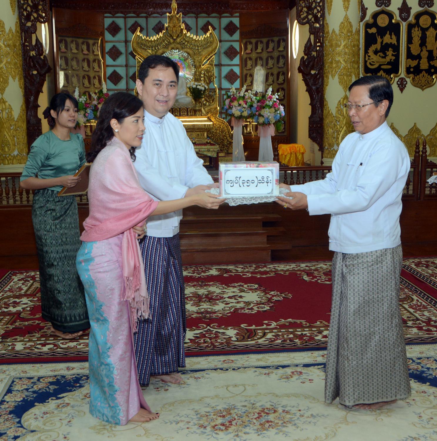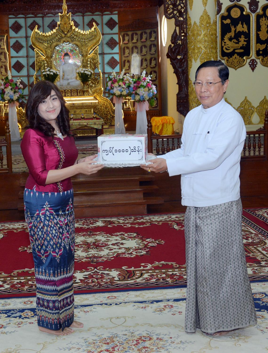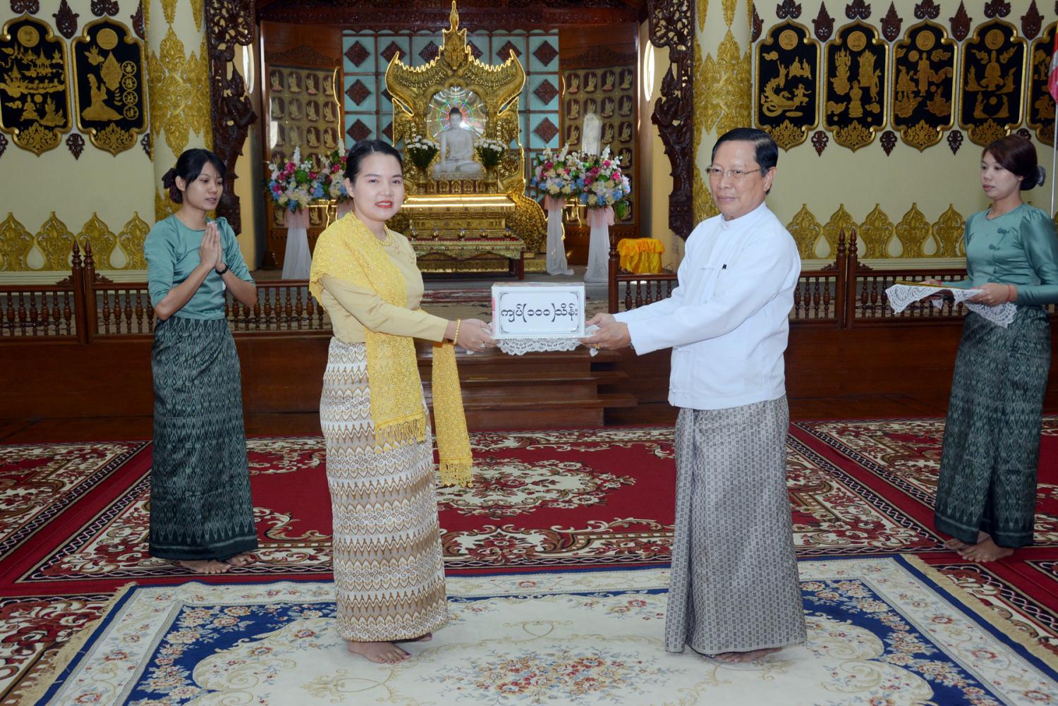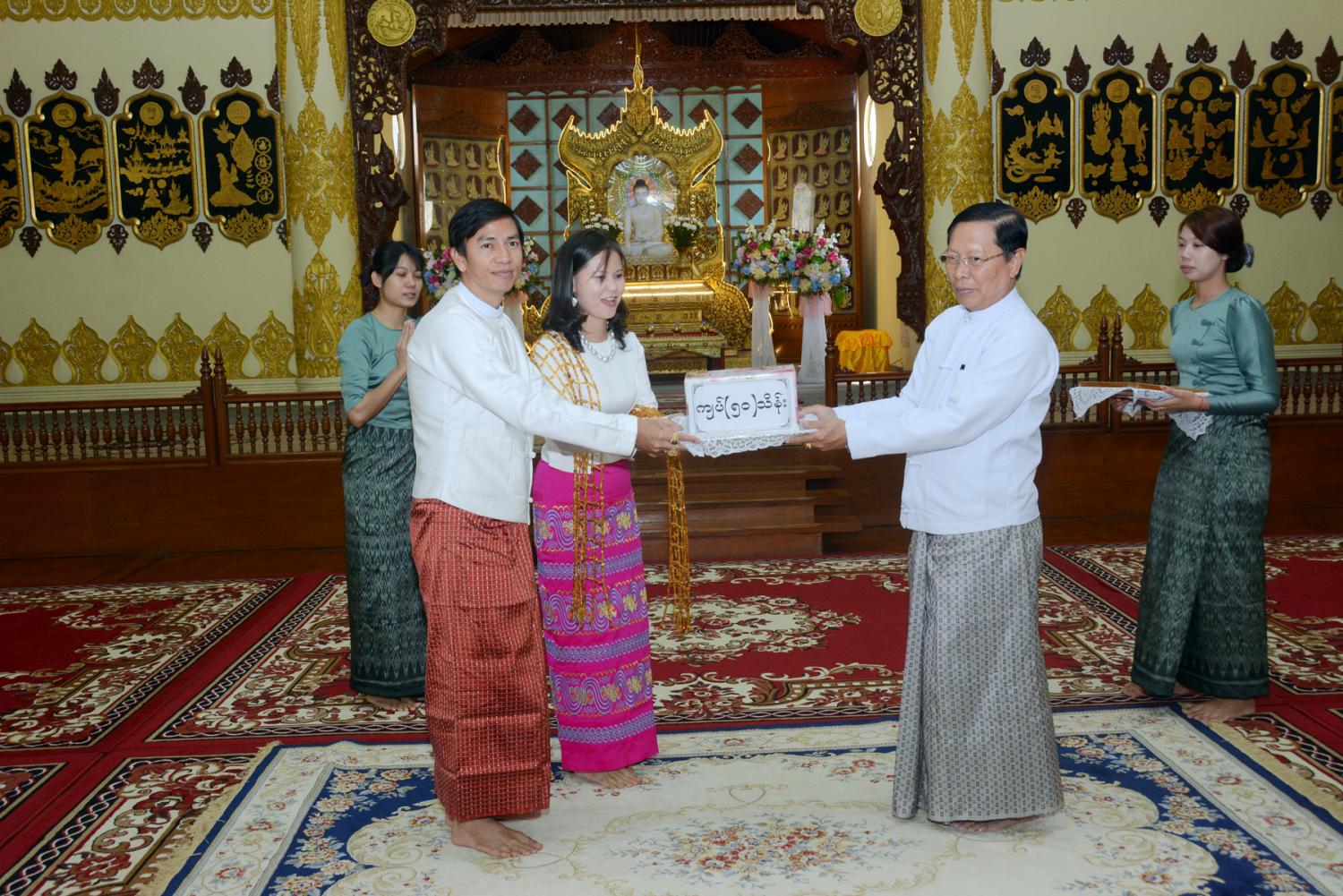 အလှူတော်ငွေပေးအပ်လှူဒါန်းပွဲ အခမ်းအနားတွင် Fuxing Brothers Group of Companies ဥက္ကဋ္ဌ ဦးအိုင်ထွန်း+သုဓမ္မသိင်္ဂီ ဒေါ်နန်းခင်ညွန့် မိသားစုက ထာဝရ ငြိမ်းချမ်းရေး စေတီတော် ဘက်စုံ မွမ်းမံ တည်ဆောက်ရေးနှင့် အချော သတ်လုပ်ငန်းများ ဆောင်ရွက်ရန်အတွက် အလှူငွေ ကျပ်သိန်း ၃၃၂၀ နှင့် နယ်စပ်တောင်တန်းဒေသ သာသနာပြု လုပ်ငန်းများ အတွက် အလှူငွေကျပ် သိန်း ၃၀၀ ၊ အဂ္ဂမဟာသီရိသုဓမ္မ မဏိဇောတဓရ ဦးဇော်မိုးခိုင် + ဒေါက်တာစောနေနွယ် (AA Medical Products Co., Ltd.) မိသားစုက ထာဝရ ငြိမ်းချမ်း ရေးစေတီတော် ဘက်စုံမွမ်းမံတည်ဆောက်ရေးနှင့် အချောသတ်လုပ်ငန်းများ ဆောင်ရွက်ရန် အတွက် အလှူငွေကျပ် သိန်း ၁၂၀၀ နှင့် နယ်စပ်တောင်တန်းဒေသ သာသနာပြု လုပ်ငန်းများအတွက် အလှူ ငွေကျပ် သိန်း ၃၅၀ တို့ကိုလည်းကောင်း၊ ထာဝရငြိမ်းချမ်းရေးစေတီတော် ဘက်စုံမွမ်းမံ တည်ဆောက်ရေး နှင့် အချောသတ် လုပ်ငန်းများ ဆောင်ရွက်ရန် အတွက် ဦးဝင်းဖေ + ဒေါ်ရွှေချော၊ သမီး သီရိသုဓမ္မသိင်္ဂီ ဒေါ်နီလာ၊ သီဟသုဓမ္မသိင်္ဂီ ဒေါ်နန်းဝါ မိသားစုက အလှူငွေကျပ် သိန်း ၁၀၀၀ ၊ သီရိသုဓမ္မမဏိဇောတဓရ ဦးမိုးအား အမှူးထား၍ ဗိုလ်မှူး ကျော်ကိုကိုရှိန်း+ မမိုးပြည့်ပြည့်ဖြိုး မိသားစု(မုံရွာဆရာမိုး တိုင်းရင်းဆေးဝါး ထုတ်လုပ် ရေးနှင့် KS Diamond ရတနာဆိုင်) က အလှူငွေကျပ် သိန်း ၅၀၀ ၊ SME Development Bank ဒုတိယဥက္ကဋ္ဌ ဒေါက်တာ ဇေယျာညွန့် + သီရိသုဓမ္မသိင်္ဂီ ဒေါ်အိသန္တာဘို မိသားစုက အလှူငွေကျပ် သိန်း ၂၀၀ ၊ သီဟ သုဓမ္မသိင်္ဂီ ဒေါ်ပိုးအိဖြူမောင် (ပြည့်ဝခိုင်မာ ဆောက် လုပ်ရေးကုမ္ပဏီ)က အလှူငွေကျပ် သိန်း ၁၀၀ နှင့် ဦးဇော်မင်းခိုင် + ဒေါ်ဥမ္မာခိုင် မိသားစု(မြန်မာ့ရိုးရာစက်မှု လက်မှုကုမ္ပဏီလီမိတက်)က အလှူငွေ ကျပ် သိန်း ၅၀ တို့ကိုလည်း ကောင်းပေးအပ်လှူဒါန်းကြရာ သာသနာရေးနှင့် ယဉ်ကျေးမှုဝန်ကြီးဌာန ပြည်ထောင်စု ဝန်ကြီး သူရဦးအောင်ကိုက လက်ခံရယူပြီး ဂုဏ်ပြုမှတ်တမ်းလွှာများ ပြန်လည်ပေးအပ်ကာ ကျေးဇူး တင် ဝမ်းမြောက် စကား ပြောကြားသည်။
