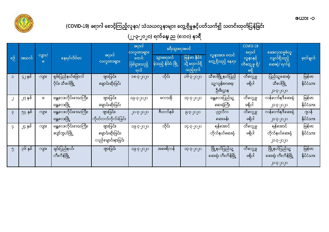 ၂။ ထိုသို့ဆောင်ရွက်ရာတွင် (၂၁-၃-၂၀၂၀) ရက်နေ့၊ နေ့လယ် (၁၂:၀၀) နာရီမှ (၂၂-၃-၂၀၂၀) ရက် နေ့လယ် (၁၂:၀၀) နာရီအထိ စောင့်ကြည့်လူနာအသစ် (၅) ဦး ရှိပါသည်။ (ဇယား -၁)