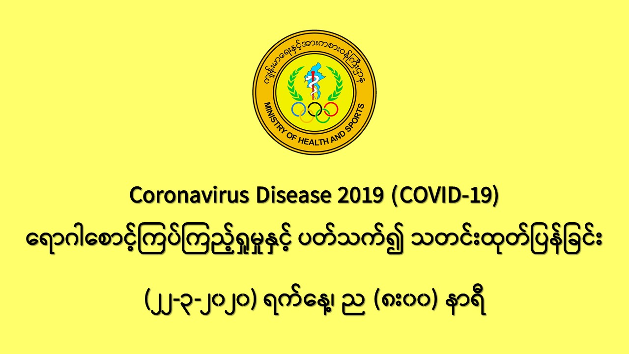 ၆။ (၂၂-၃-၂၀၂၀) ရက်နေ့အထိ မြန်မာနိုင်ငံတွင် COVID-19 ရောဂါ ဓာတ်ခွဲအတည်ပြုလူနာ မတွေ့ရှိသေးသော်လည်း ရောဂါစောင့်ကြပ်ကြည့်ရှုခြင်း လုပ်ငန်းများကို အရှိန်အဟုန်မြှင့်၍ ဆောင်ရွက်လျက်ရှိပါသည်။ ယခုအခါ တရုတ်ပြည်သူ့သမ္မတနိုင်ငံနှင့် အိမ်နီးချင်းနိုင်ငံအချို့ အပါအဝင် ကမ္ဘာ့နိုင်ငံ (၁၈၅) နိုင်ငံတွင် COVID-19 ရောဂါ ကူးစက်ဖြစ်ပွားလျက်ရှိသဖြင့် ပြည်သူလူထုအနေဖြင့် ကျန်းမာရေးနှင့် အားကစားဝန်ကြီးဌာနမှ ထုတ်ပြန်ထားသော ရောဂါ ကာကွယ်ရေးဆိုင်ရာ ကျန်းမာရေး အသိပညာပေး အချက်အလက်များအား တိကျစွာ လိုက်နာ ဆောင်ရွက်ရန် နှိုးဆော်အပ်ပါသည်။