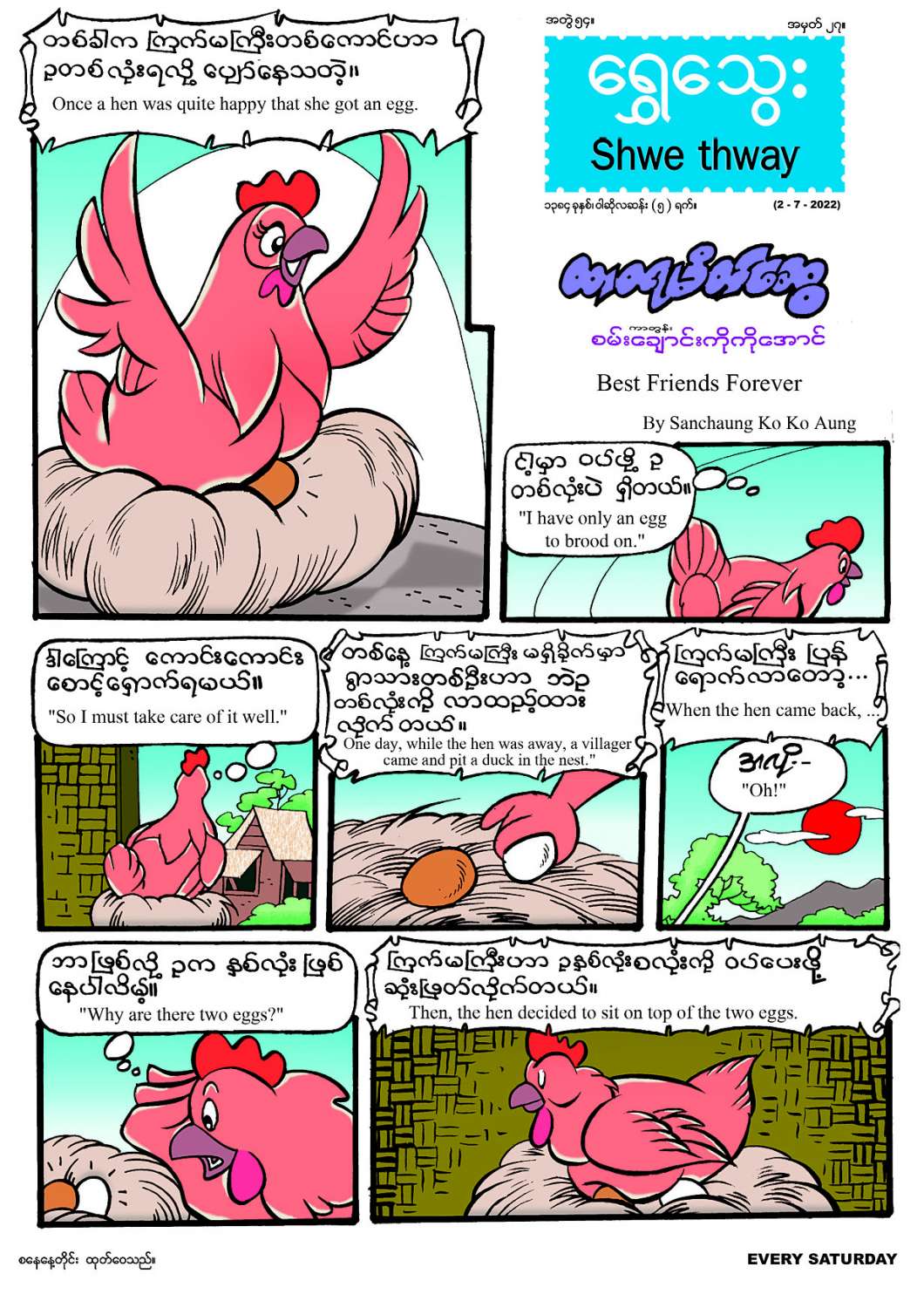 ၂-၇-၂၀၂၂ ရက် (စနေနေ့)တွင် ထွက်ရှိမည့် ရွှေသွေးဂျာနယ်အတွဲ (၅၄)၊ အမှတ်(၂၇) တွင် သူတစ်ပါးအပေါ် စိတ်ကောင်းစေတနာထားကာ ကျွေးမွေးစောင့်ရှောက်ပါက မိမိအပေါ်တွင်လည်း ပြန်လည်ကောင်းမွန်နိုင်ကြောင်းကို တင်ဆက်ထားသည့် “ထာဝရမိတ်ဆွေ” မျက်နှာဖုံးဇာတ်လမ်း၊ ကလေးများအနေဖြင့် ရေကိုကျန်းမာရေးနှင့်ညီညွတ်စွာ သောက်သုံးပုံများနှင့် ရေသောက်သုံးခြင်းဖြင့် ရရှိလာမည့် အကျိုးတရားများ၊ ရေလှူခြင်းဖြင့် ရရှိလာမည့် အကျိုးတရားများအကြောင်းကို ရေးဖွဲ့ထားသည့် “ရေ၏တန်ဖိုးနှင့် အကျိုးဆယ်ပါး” သုတဆောင်းပါး၊ မိုးရာသီတွင် သီးနှံများ စိုက်ပျိုးဖြစ်ထွန်းပုံကို တင်ဆက်ထားသည့် “ရာဇာ ခရမ်း- မိုးနှင့်အတူ” နှစ်မျက်နှာ ကာတွန်း၊ ရေရှားပါးမှုနှင့် ကြုံတွေ့နေရသော ရွာသူရွာသားများ၏ ဒုက္ခကို ဖြေရှင်းဆောင်ရွက်ပေးခဲ့သော မဥဩလေးအကြောင်းကို အတုယူဖွယ် ရေးဖွဲ့ထားသည့် “ရပ်ရွာအတွက် စွန့်စားသူ” ပုံပြင်၊ အိပ်မက်သော ဖိုးထူးအကြောင်းကို တင်ဆက်ထားသည့် “ဖိုးထူး” တစ်မျက်နှာကာတွန်း၊ မိမိ၏ မစဉ်းစားမဆင်ခြင်ပြောမိ၊ လုပ်ကိုင်မိသော အပြုအမူများကြောင့် ဒုက္ခနှင့်ကြုံတွေ့ရပုံကို ရေးဖွဲ့ထားသည့် “စကားဟူသည်” ဝတ္ထု၊ မိမိ၏ကြွယ်ဝချမ်းသာမှုကို မြှောက်ပင့်ပြောဆိုသည်ကို ကျေနပ်နှစ်သက်သော သူဌေးကြီးနှင့် သူတစ်ပါးကို အကြောင်းအကျိုးမရှိဘဲ မြှောက်ပင့်စကားမဆိုတတ်သော လူငယ်လေး အကြောင်းကို တင်ဆက်ထားသည့် “ကောက်ပင်ရိတ်လှီး” နှစ်မျက်နှာကာတွန်း၊ စကားပြောဆိုရာ၌ အစပထမတွင် ဟုတ်တိပတ်တိရှိသော်လည်း နောက်ပိုင်းတွင် အဖျားရှူးသွားသည့် ဘုန်းကြီး ဦးမေဓာကို သင်္ဂဇာဆရာတော်မှ ဥပမာပေးပြောဆိုသည်ကို သရုပ်ဖော်တင်ဆက်ထားသည့် ကာတွန်းလွမ်းမောင်(သုဝဏ္ဏ) ၏ “အဖျားရှူးမသွားနဲ့ဦး” နှစ်မျက်နှာကာတွန်း၊ Adjective (နာမဝိသေသန) များ၏ အသုံးအနှုန်းနှင့် ဝါကျများတွင် Adjective များ ထည့်သွင်းအသုံးပြုပုံအကြောင်းကို လေ့ကျင့်ခန်းများနှင့်တကွ တင်ဆက်ထား သည့် “ရွှေသွေး အင်္ဂလိပ်သဒ္ဒါ” အင်္ဂလိပ်စာ သင်ခန်းစာကဏ္ဍ၊ ဉာဏ်စမ်းကဏ္ဍနှင့် ကဗျာ ကဏ္ဍတို့အပါအဝင် ကဏ္ဍစုံလင်စွာထွက်ရှိပြီဖြစ်ရာ တစ်စောင်လျှင် ငွေကျပ် ၄၀၀ ဖြင့် စာပေဗိမာန် စာအုပ်အရောင်းဆိုင်များတွင် ဝယ်ယူနိုင်ကြောင်း သိရသည်။