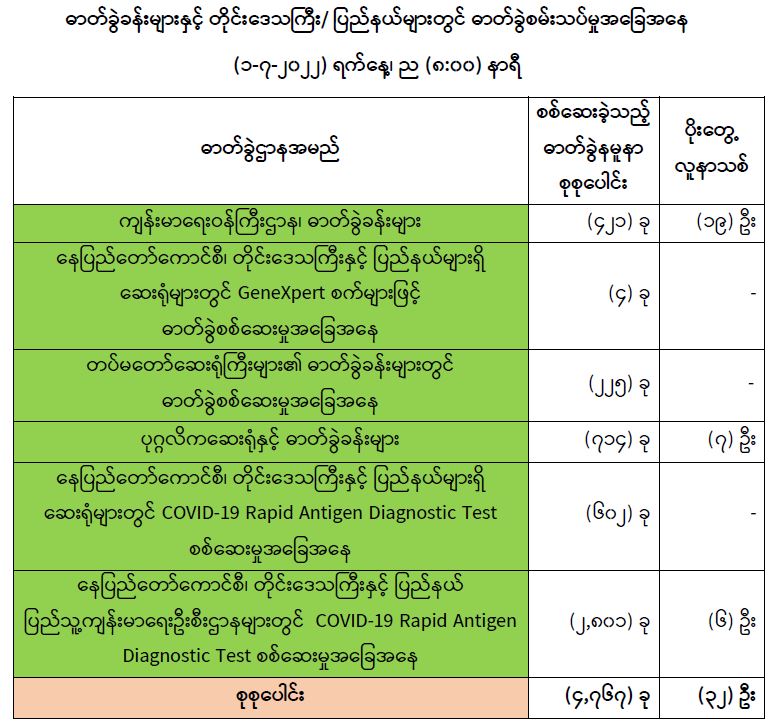 သို့ဖြစ်ပါ၍ ယနေ့အထိ ဓာတ်ခွဲနမူနာစုစုပေါင်း (၈,၃၇၇,၄၁၃) ခုအားစစ်ဆေးခဲ့ပြီး COVID-19 ဓာတ်ခွဲအတည်ပြုလူနာ စုစုပေါင်း (၆၁၃,၆၂၈) ဦး ရှိပြီ ဖြစ်ပါသည်။
