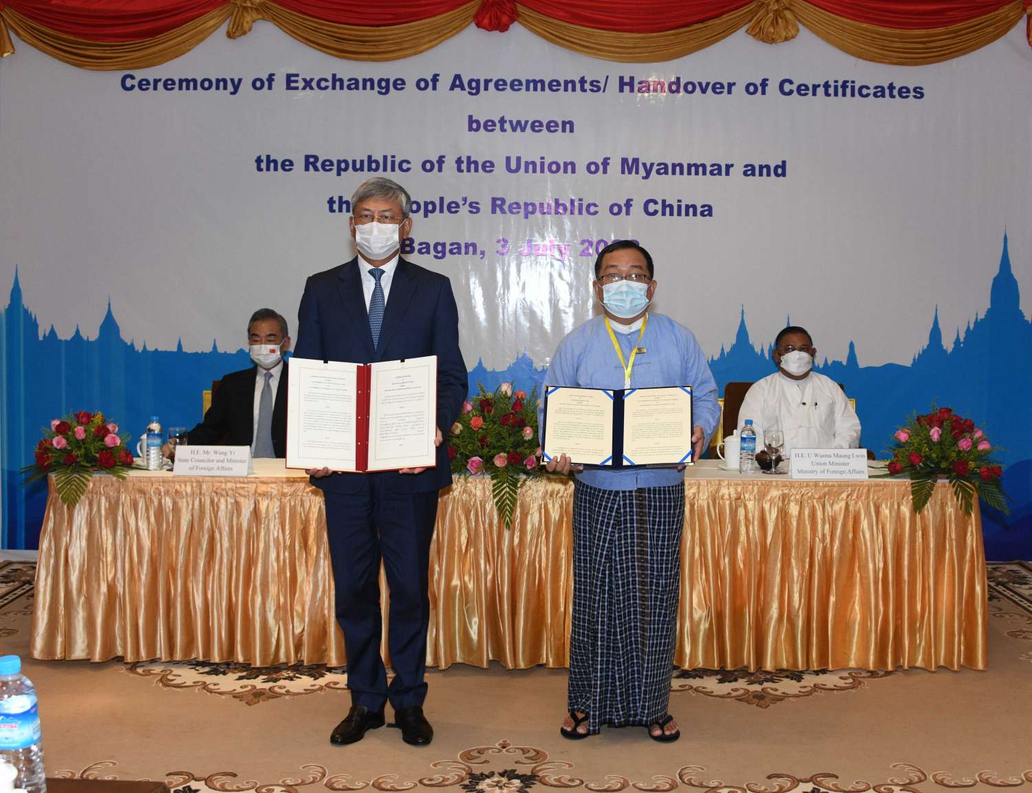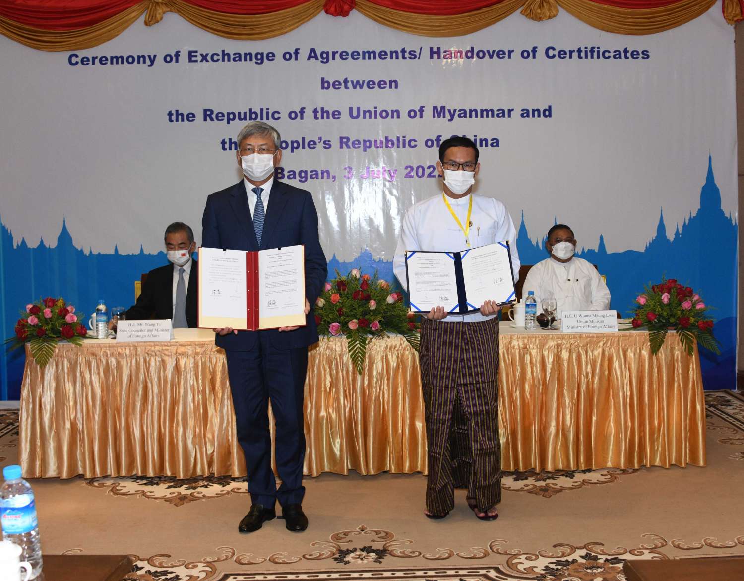 နှစ်နိုင်ငံ ဆွေးနွေးပွဲအပြီးတွင် နိုင်ငံခြားရေးဝန်ကြီးများ၏ ရှေ့မှောက်၌ လန်ချန်း-မဲခေါင် ပူးပေါင်းဆောင်ရွက်မှု အထူးရန်ပုံငွေ ၂၀၂၂ ခုနှစ် စီမံကိန်းရန်ပုံငွေ လွှဲပြောင်းလက်ခံလွှာ၊ စီးပွားရေးနှင့် နည်းပညာ ပူးပေါင်းဆောင်ရွက်ရေး သဘောတူညီချက်၊ တရုတ်နိုင်ငံ၏ အထောက်အပံ့ဖြင့် အမှတ်(၂) စက်မှုသင်တန်းကျောင်း (မန္တလေး) အဆင့်မြှင့်တင်ရေး စီမံကိန်း သဘောတူညီချက်၊ တိရစ္ဆာန်ရောဂါရှာဖွေရေး ဓါတ်ခွဲခန်း အဆင့်မြှင့်တင်ရေး စီမံကိန်းသဘောတူညီချက်၊ တရုတ်နိုင်ငံမှ မြန်မာနိုင်ငံ မြောက်ပိုင်းဒေသသို့ လှူဒါန်းသည့် ယွမ် (၁၀ ဒသမ ၅) သန်းတန်ဖိုးရှိ အရေးပေါ် ကူးစက်ရောဂါကာကွယ်ရေး အထောက်အပံ့များနှင့် မြန်မာနိုင်ငံသို့ လှူဒါန်းသည့် ယွမ် (၃၂) သန်းတန်ဖိုးရှိ အရေးပေါ် ကူးစက်ရောဂါကာကွယ်ရေး အထောက်အပံ့များဆိုင်ရာ လွှဲပြောင်းပေးအပ်/ လက်ခံလွှာ၊ တရုတ်နိုင်ငံမှ မြန်မာနိုင်ငံသို့ အလွယ်တကူ တပ်ဆင်နိုင်သည့် အိမ်အလုံးရေ (၁,၀၀၀) လွှဲပြောင်းပေးအပ်/လက်ခံလွှာတို့ကို မြန်မာဘက်မှ သက်ဆိုင်ရာဝန်ကြီးဌာနများမှ ကိုယ်စားလှယ်များနှင့် တရုတ်ဘက်မှ မြန်မာနိုင်ငံဆိုင်ရာ တရုတ်သံအမတ်ကြီးတို့က လွှဲပြောင်းလက်ခံ လဲလှယ်ခဲ့ကြသည်။