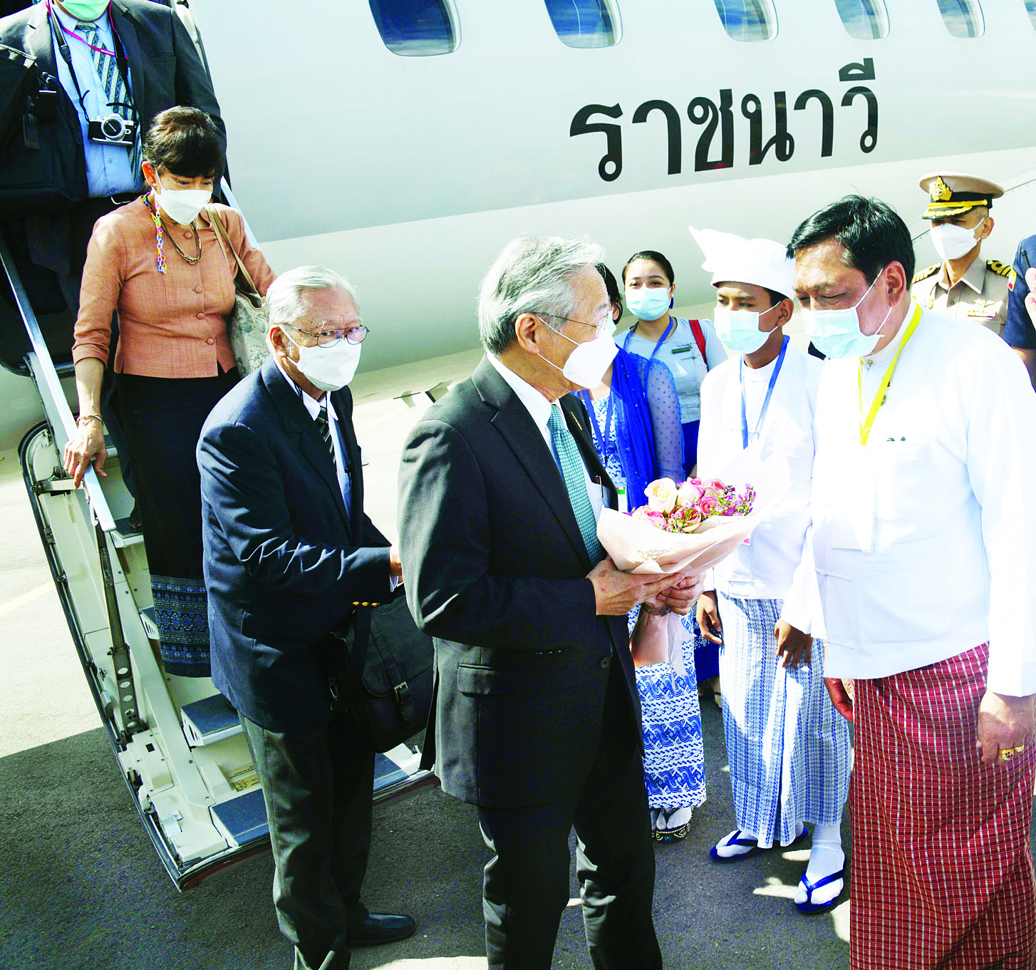 မဲခေါင်-လန်ချန်းအဖွဲ့ဝင်နိုင်ငံများမှ နိုင်ငံခြားရေးဝန်ကြီးများဖြစ်ကြသည့် ကမ္ဘောဒီးယား ဒုတိယဝန်ကြီးချုပ်၊ နိုင်ငံခြားရေးနှင့်အပြည်ပြည်ဆိုင်ရာ ပူးပေါင်းဆောင်ရွက်ရေးဝန်ကြီး H.E. Mr. Prak Sokhonn ၊ လာအိုဒုတိယဝန်ကြီးချုပ်နှင့် နိုင်ငံခြားရေးဝန်ကြီး H.E. Mr. Saleumxay Kommasith၊ ထိုင်း ဒုတိယဝန်ကြီးချုပ်နှင့် နိုင်ငံခြားရေးဝန်ကြီး H.E. Mr. Don Pramudwinai နှင့် ဗီယက်နမ် နိုင်ငံခြားရေးဝန်ကြီး H.E. Mr. Bui Thanh Son တို့သည် (၇)ကြိမ်မြောက် မဲခေါင်-လန်ချန်း ပူးပေါင်းဆောင်ရွက်မှု နိုင်ငံခြားရေးဝန်ကြီးများ အစည်းအဝေးသို့ တက်ရောက်ရန် ၎င်းတို့၏ ကိုယ်စားလှယ်အဖွဲ့ဝင်များနှင့်အတူ ယနေ့ မွန်းလွဲပိုင်းတွင် ပုဂံမြို့ရှိ ညောင်ဦးလေဆိပ်သို့ ရောက်ရှိကြရာ နိုင်ငံခြားရေးဝန်ကြီးဌာနမှ ဒုတိယဝန်ကြီး ဦးကျော်မျိုးထွဋ်၊ မန္တလေးတိုင်းဒေသကြီးအစိုးရအဖွဲ့မှ သယံဇာတနှင့် သဘာဝပတ်ဝန်းကျင် ထိန်းသိမ်းရေးဝန်ကြီး ဦးမျိုးအောင်၊ နိုင်ငံခြားရေးဝန်ကြီးဌာန၊ သံတမန်ရေးရာဦးစီးဌာန ညွှန်ကြားရေးမှူးချုပ် ဦးဝဏ္ဏဟန်နှင့် သက်ဆိုင်ရာ တာဝန်ရှိသူတို့က လေဆိပ်၌ ကြိုဆိုကြသည်။