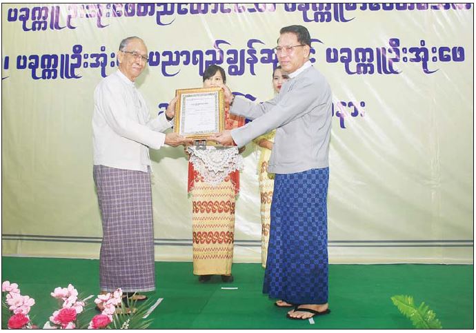ယင်းနောက် ဆုချီးမြှင့်ပွဲကို ကျင်းပရာ ပြည်ထောင်စုဝန်ကြီးက ပခုက္ကူစာပေတစ်သက်တာစာပေဆုရ ဒေါက်တာမျိုးသန့်တင်နှင့် ဦးညွန့်ဆွေ (မောင်ဆွေသက်) တို့အား ဆုပေးအပ်ချီးမြှင့်သည်။