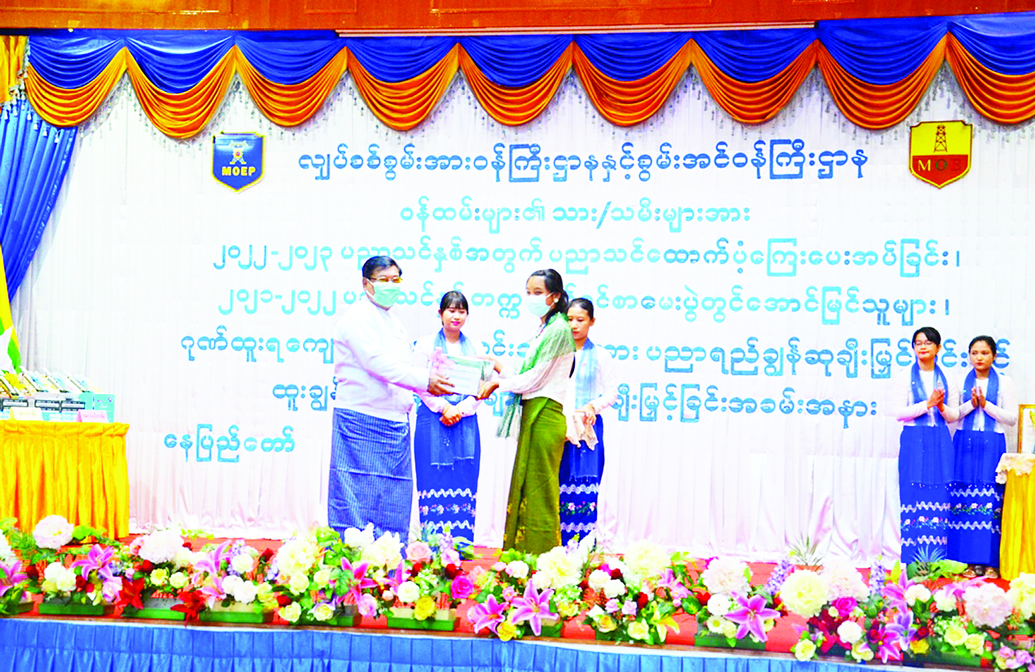 ထို့နောက် ပြည်ထောင်စုဝန်ကြီး ဦးသောင်းဟန်က ခြောက်ဘာသာဂုဏ်ထူးဖြင့် ထူးချွန်စွာအောင်မြင်ခဲ့သူများကို လည်းကောင်း၊ လျှပ်စစ်စွမ်းအားဝန်ကြီးဌာန ဒုတိယဝန်ကြီး ဒေါက်တာအောင်ဇေယျနှင့် စွမ်းအင်ဝန်ကြီးဌာန ဒုတိယဝန်ကြီး ဦးသန့်စင်တို့က ငါးဘာသာဂုဏ်ထူးဖြင့် ထူးချွန်စွာအောင်မြင်ခဲ့သူများကို လည်းကောင်း၊ ဌာနအကြီးအကဲများက လေးဘာသာဂုဏ်ထူးဖြင့် ထူးချွန်စွာ အောင်မြင်ခဲ့သူများနှင့် ထူးချွန်ဆုရ ဝန်ထမ်းများကို လည်းကောင်း ပညာသင်ထောက်ပံ့ကြေး၊ ပညာရည်ချွန်ဆုနှင့် ဂုဏ်ပြုဆုငွေ စုစုပေါင်းငွေကျပ် ၆၅၇၆၆၅၀၀ ကို ချီးမြှင့်ခဲ့ကြပြီး ဂုဏ်ထူးရကျောင်းသား ကျောင်းသူများကိုယ်စား ခြောက်ဘာသာဂုဏ်ထူးရှင် မဆုရတနာထွန်းက ကျေးဇူးတင်စကား ပြန်လည်ပြောကြားခဲ့ကာ ပြည်ထောင်စုဝန်ကြီး၊ ဒုတိယဝန်ကြီးများ၊ ဌာနအကြီးအကဲများသည် ထူးချွန်ဆုရ ဝန်ထမ်းများ၊ ဂုဏ်ထူးရ ကျောင်းသား ကျောင်းသူများနှင့်အတူ စုပေါင်းမှတ်တမ်းတင်ဓာတ်ပုံ ရိုက်ခဲ့ကြောင်း သိရသည်။