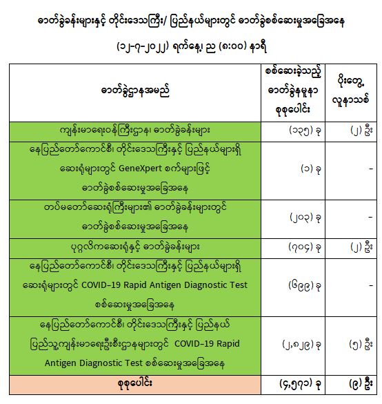 သို့ဖြစ်ပါ၍ ယနေ့အထိ ဓာတ်ခွဲနမူနာစုစုပေါင်း (၈,၄၃၀,၉၁၅) ခုအားစစ်ဆေးခဲ့ပြီး COVID-19 ဓာတ်ခွဲအတည်ပြုလူနာ စုစုပေါင်း (၆၁၃,၇၆၀) ဦး ရှိပြီ ဖြစ်ပါသည်။