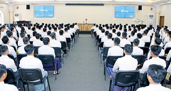 နိုင်ငံတိုင်းသည် မိမိတို့၏ အကျိုးစီးပွားအတွက် စီးပွားရေး၊ ပညာရေး၊ လူမှုရေး ကဏ္ဍပေါင်းစုံတွင် ကြိုးပမ်းအားထုတ်နေရမည်ဖြစ်ပြီး Moving Forward ဟူသည့်အတိုင်း အမြဲလျှောက်လှမ်းနေရမည်ဖြစ်ကြောင်း၊ ရပ်နေပါက မိမိတို့တိုင်းပြည် နောက်ကျ ကျန်နေခဲ့မည်ဖြစ်ကြောင်း၊ တိုင်းပြည်တည်ဆောက်ရာတွင် လူသားအရင်းအမြစ်ကောင်းများ ပေါ်ထွက်ရေးသည် အဓိကအရေးကြီးဆုံးဖြစ်သဖြင့် ပညာတတ် လူသားအရင်းအမြစ်များ ပေါကြွယ်ဝရေး ကြိုးပမ်းဆောင်ရွက်လျက်ရှိကြောင်း၊ ပညာတော်သင် သင်တန်းသားများအနေဖြင့်လည်း သင်ကြားပေးသည့် အတတ်ပညာများကို အလေးအနက်ထား သင်ယူသွားကြရန်လိုအပ်ပြီး အမြဲမပြတ်လေ့လာအားထုတ်နေကြရမည်ဖြစ်ကြောင်း၊ နိုင်ငံတော်နှင့် တပ်မတော်မှ ငွေကြေးအရင်းအနှီး၊ အချိန်အရင်းအနှီး များစွာကုန်ကျထားပြီး ပညာတော်သင်စေလွှတ်ပေးထားခြင်းဖြစ်သဖြင့် မိမိတို့၏ တစ်ဦးချင်းအတွက်၊ တပ်မတော်အတွက်၊ တိုင်းပြည်အတွက် အားကိုးအားထားရသည့် ပညာတတ်လူသားအရင်းအမြစ်များဖြစ်အောင် ကြိုးပမ်းဆောင်ရွက်ကြရမည်ဖြစ်ကြောင်း၊ တပ်မတော်သားများဖြစ်သည်နှင့်အညီ စည်းကမ်းစနစ်တကျဖြင့် နေထိုင် သွားလာလှုပ်ရှားရမည်ဖြစ်ပြီး ဒေသန္တရထုတ်ပြန်ထားသည့် စည်းမျဉ်းစည်းကမ်းများကိုလည်း လိုက်နာကြရန်လိုကြောင်း၊ စည်းကမ်းစနစ်တကျနေထိုင်၍ ကျန်းမာရေး ကောင်းမွန်ရေးအတွက်ကိုလည်း တစ်ဦးချင်းအသိ၊ သတိဖြင့် ဂရုစိုက်နေထိုင်ကြရန် လိုကြောင်း၊ အချင်းချင်းစည်းလုံးညီညွတ်စွာ နေထိုင်လုပ်ကိုင်ဆောင်ရွက်ကြပြီး မိမိနိုင်ငံ ဖွံ့ဖြိုးတိုးတက်ရေးအတွက် တစ်ဖက်တစ်လမ်းမှ ကြိုးပမ်းဆောင်ရွက်ကြစေလိုကြောင်းဖြင့် မှာကြားသည်။