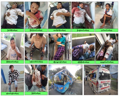 ထိုသို့လုပ်ဆောင်လျက်ရှိရာတွင် ဇူလိုင်လ ၁၁ ရက် ညနေ ၄ နာရီခွဲအချိန်တွင် စစ်ကိုင်းတိုင်း ဒေသကြီး၊ ချောင်းဦးမြို့နယ်၊ ခင်မွန်ကျေးရွာအနီး မုံရွာ-မန္တလေးသွားကားလမ်း မိုင်တိုင်အမှတ် ၇၁ မိုင် ၂ ဖာလုံနှင့် ၃ ဖာလုံအကြား၌ ခရီးသည်တင်ယာဉ်တစ်စီးအား PDF အမည်ခံအကြမ်းဖက်သမားများက မိုင်းဆွဲတိုက်ခိုက်ခဲ့သဖြင့် ခရီသည်တင်ယာဉ်ပေါ်ပါ ခရီးသည်များ ထိခိုက်ဒဏ်ရာရရှိခဲ့ကြောင်း သတင်းအရ လုံခြုံရေးတပ်ဖွဲ့ဝင်များက သွားရောက်စစ်ဆေးခဲ့ရာ “ရွှေသလ္လာ” ခရီးသည်တင်ယာဉ်သည် မုံရွာမြို့မှ ခရီးသည် ၁၂ ဦးတင်ဆောင်ကာ မန္တလေးမြို့သို့ မုံရွာ-မန္တလေးကားလမ်းအတိုင်း မောင်းနှင်လာစဉ် အခင်းဖြစ်နေရာအရောက်၌ PDF အမည်ခံ အကြမ်းဖက်သမားများက လက်လုပ်မိုင်း ၄ လုံးဖြင့် ဖောက်ခွဲတိုက်ခိုက်ခဲ့သဖြင့် မော်တော်ယာဉ်၏ ရှေ့၊ နောက်၊ ဘေးလေကာမှန်များနှင့် ဘီး ၄ လုံစလုံးကွဲကာ ယာဉ်မောင်း ကိုအောင်မိုးဟိန်း၊ အကူယာဉ်မောင်း ဦးလှဝင်းမောင်၊ ယာဉ်နောက်လိုက် ကိုရန်အောင်ထွန်းနှင့် ယာဉ်ပေါ်လိုက်ပါစီးနင်းလာသည့် ခရီးသည် ၉ ဦးတို့တွင် ပေါက်ကွဲစထိမှန်ဒဏ်ရာများ အသီးသီးရရှိခဲ့ကြောင်း၊ အဆိုပါ ထိခိုက်ဒဏ်ရာရရှိခဲ့သူများအား လူမှုကူညီရေးယာဉ် ၇ စီးဖြင့်တင်ဆောင်ကာ မုံရွာမြို့ပြည်သူ့ ဆေးရုံကြီးသို့ ပို့ဆောင်စဉ် အခင်းဖြစ်စဉ် နေရာနှင့် ၁ ဖာလုံခန့်အကွာသို့အရောက်၌ PDF အမည်ခံအကြမ်းဖက်သမားများက လက်လုပ်မိုင်း တစ်လုံးဖြင့် ထပ်မံဖောက်ခွဲတိုက်ခိုက်ခဲ့သဖြင့် လူထိခိုက်မှုမရှိသော်လည်း လူမှုကူညီရေးယာဉ်တစ်စီး၏ အနောက်လေကာမှန်တစ်ချပ် ကွဲအက်ပျက်စီးခဲ့ကြောင်း သိရှိရသည်။