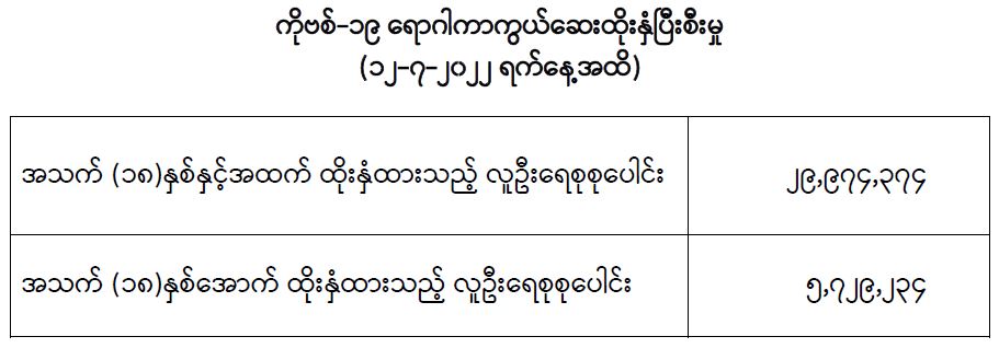 COVID-19 ရောဂါ ကာကွယ်ထိန်းချုပ်ရေးအတွက် တိုင်းဒေသကြီး/ပြည်နယ်များတွင် COVID-19 ရောဂါကာကွယ်ဆေးကို ဦးတည်အုပ်စုများသတ်မှတ်၍ ထိုးနှံပေးလျက်ရှိရာ (၁၂-၇-၂၀၂၂) ရက်နေ့ အထိ အသက် (၁၈) နှစ်နှင့်အထက် လူဦးရေစုစုပေါင်း (၂၉,၉၇၄,၃၇၄) ဦး နှင့် အသက် (၁၈)နှစ်အောက် လူဦးရေစုစုပေါင်း (၅,၇၂၉,၂၃၄) ဦးတို့အား ထိုးနှံထားရှိပြီး ဖြစ်ပါသည်။