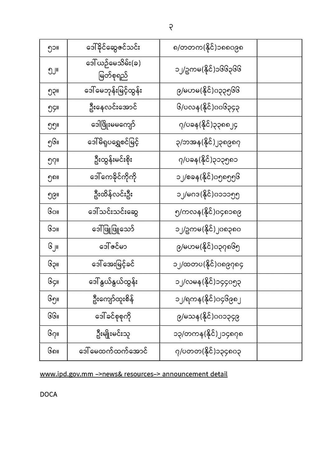 ကုန်အမှတ်တံဆိပ်မှတ်ပုံတင်ခြင်းဆိုင်ရာကိုယ်စားလှယ်သင်တန်း (၂/၂၀၂၂) သင်တန်းဝင်ခွင့် ရရှိသည့် သင်တန်းသားအမည်စာရင်းထုတ်ပြန်ခြင်း (မူကြမ်း)(ပထမပိုင်း) 07/15/2022 ကုန်အမှတ်တံဆိပ်မှတ်ပုံတင်ခြင်းဆိုင်ရာကိုယ်စားလှယ်သင်တန်း (၂/၂၀၂၂) သင်တန်းဝင်ခွင့် ရရှိသည့် သင်တန်းသားအမည်စာရင်းထုတ်ပြန်ခြင်း (မူကြမ်း)(ပထမပိုင်း)
