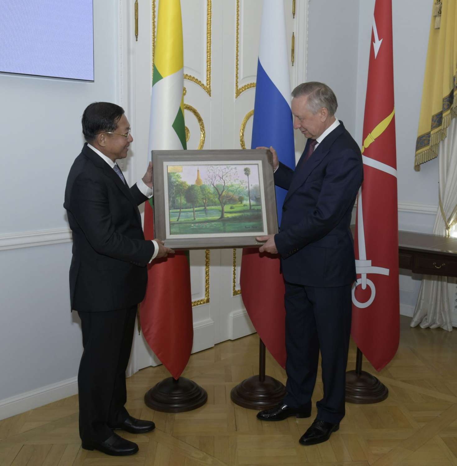 ထိုသို့ တွေ့ဆုံဆွေးနွေးရာတွင် စိန့်ပီတာစဘတ်မြို့ အစိုးရအဖွဲ့အနေဖြင့် နိုင်ငံတော် စီမံအုပ်ချုပ်ရေးကောင်စီဥက္ကဋ္ဌ၊ နိုင်ငံတော်ဝန်ကြီးချုပ်နှင့် ကိုယ်စားလှယ်အဖွဲ့ဝင်များအား ခင်မင်ရင်းနှီးစွာ ကြိုဆိုကြောင်းနှင့် ရုရှား-မြန်မာ နှစ်နိုင်ငံ ကောင်းမွန်သည့် ဆက်ဆံရေး သမိုင်းကြောင်းသည် နှစ်ပေါင်း ၇၅ နှစ် ကျော်ရှိပြီဖြစ်သည့် အခြေအနေများ၊ စိန့်ပီတာစဘတ်မြို့အခြေစိုက် ကုမ္ပဏီများအနေဖြင့် မြန်မာနိုင်ငံရှိ စိုက်ပျိုးရေးလုပ်ငန်းများတွင် လာရောက်ပူးပေါင်း ဆောင်ရွက်လိုသည့် အခြေအနေများအပြင် ကျန်းမာရေးစောင့်ရှောက်မှုနယ်ပယ်၊ ပညာရေးနယ်ပယ်၊ ခရီးသွားလုပ်ငန်း ဖွံ့ဖြိုးတိုးတက်မှုနယ်ပယ်၊ စီးပွားရေး ဖွံ့ဖြိုးတိုးတက်မှုနယ်ပယ်၊ ဘာသာသာသနာ ထွန်းကားပြန့်ပွားရေးအတွက် ယဉ်ကျေးမှုဖလှယ်ရေးရာနယ်ပယ် စသည်ဖြင့် နယ်ပယ်ပေါင်းစုံတွင် ပူးပေါင်းဆောင်ရွက်မှုများကို တိုးမြှင့်ဆောင်ရွက်နိုင်မည့် အခြေအနေများ။