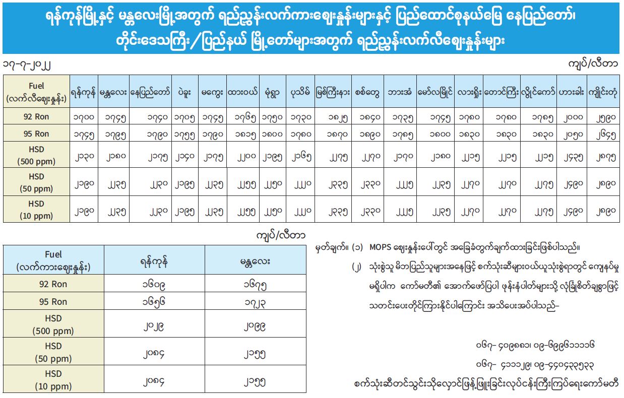 ရန်ကုန်မြို့နှင့် မန္တလေးမြို့အတွက် ရည်ညွှန်းလက်ကားဈေးနှုန်းများနှင့် ပြည်ထောင်စုနယ်မြေ နေပြည်တော်၊ တိုင်းဒေသကြီး/ပြည်နယ် မြို့တော်များအတွက် ရည်ညွှန်းလက်လီးဈေးနှုန်းများ
