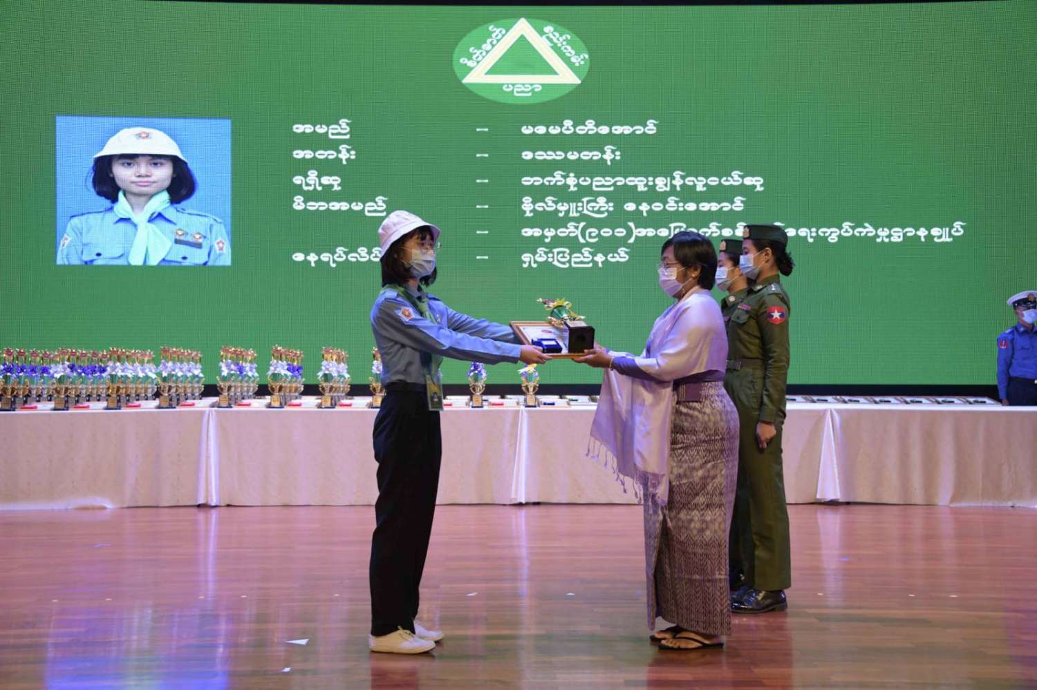 နိုင်ငံတော်စီမံအုပ်ချုပ်ရေးကောင်စီဒုတိယဥက္ကဋ္ဌ၊ ဒုတိယတပ်မတော်ကာကွယ်ရေး ဦးစီးချုပ်ကာကွယ်ရေးဦးစီးချုပ် (ကြည်း)၏ ဇနီး ဒေါ်သန်းသန်းနွယ် က ဘက်စုံပညာ ထူးချွန်ဆုရရှိသူ ဗိုလ်မှူးကြီး နေဝင်းအောင်၏ သမီး မမေပီတိအောင်၊ အရာခံဗိုလ် အောင်ကြည်၏သား မောင်ရန်လင်းအောင်၊ ဗိုလ်ကြီး မင်းဝေ(အငြိမ်းစား)၏ သမီး မဖူးပြည့်ကိုကို၊ ဒုတိယအရာခံဗိုလ်/စာရေး ဆန်းမင်းဦး ၏ သမီး မခိုင်ခိုင်မင်းဦး၊ တပ်ကြပ်ကြီး/သားဖွား ဒေါ်မိုးစန္ဒာ၏ သမီး မခင်သံသာ၊ ၂၀၂၁-၂၀၂၂ ပညာသင်နှစ် တွင် (၆)ဘာသာဂုဏ်ထူးဖြင့် ထူးချွန်စွာအောင်မြင်ခဲ့သည့် ဗိုလ်မှူးကြီး ဇော်လွင်၏ သမီး မသင်းမြတ်ရတီ၊ ဒုတိယဗိုလ်မှူးကြီး သိန်းစိုးထွန်း၏ သမီး မမြင့်မြတ်သူ၊ အရာခံဗိုလ် ကြည်စိုး၏ သမီး မသန့်ရတီအောင်၊ ဒုတိယအရာခံဗိုလ်/စာရေး မင်းကြည်လေး၏ သမီး မသူသူနှင်း၊ ဗိုလ်ကြီး အောင်ရဲထွန်း(အငြိမ်းစား)၏ သမီး မမြသက်ချယ်တို့အား ဂုဏ်ပြုတံဆိပ်၊ ဂုဏ်ပြုဆုနှင့် ဂုဏ်ပြုမှတ်တမ်းလွှာများ ပေးအပ်သည်။