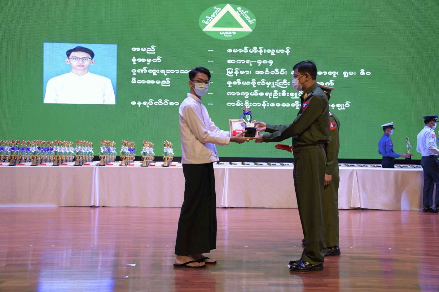 ဆက်လက်ပြီး နိုင်ငံတော်စီမံအုပ်ချုပ်ရေးကောင်စီဥက္ကဋ္ဌ တပ်မတော်ကာကွယ်ရေးဦးစီးချုပ်က ဘက်စုံပညာထူးချွန်လူငယ်ဆုရရှိသည့် ဒုတိယဗိုလ်မှူးကြီး အောင်မင်း၏သား မောင်ဇေလင်းထက်၊ အုပ်ခွဲတပ်ကြပ်ကြီး မင်းအောင်၏ သားမောင်ရဲရင့် မင်းထက်၊ ဗိုလ်ကြီး သက်နိုင်ဝင်း(အငြိမ်းစား)၏ သမီး မသွန်းပိုးရတီ၊ ၂၀၂၁-၂၀၂၂ ပညာသင်နှစ်တွင် (၆)ဘာသာဂုဏ်ထူးဖြင့် ထူးချွန်စွာအောင်မြင်ခဲ့သည့် ဗိုလ်မှူးကြီး ဒေါ်တင်မာရီ၏သား မောင်ပြေလင်းသန့်၊ ဗိုလ်ကြီး ကျော်ကျော်အောင်(အငြိမ်းစား)၏ သမီးမပန်းပြည့်သခင်၊ ဒုတိယအရာခံဗိုလ် တင်ထွန်း၏သမီး မယွန်းနဒီအောင်တို့အား ဂုဏ်ပြုတံဆိပ်၊ ဂုဏ်ပြုဆုနှင့် ဂုဏ်ပြုမှတ်တမ်းလွှာများပေးအပ်သည်။