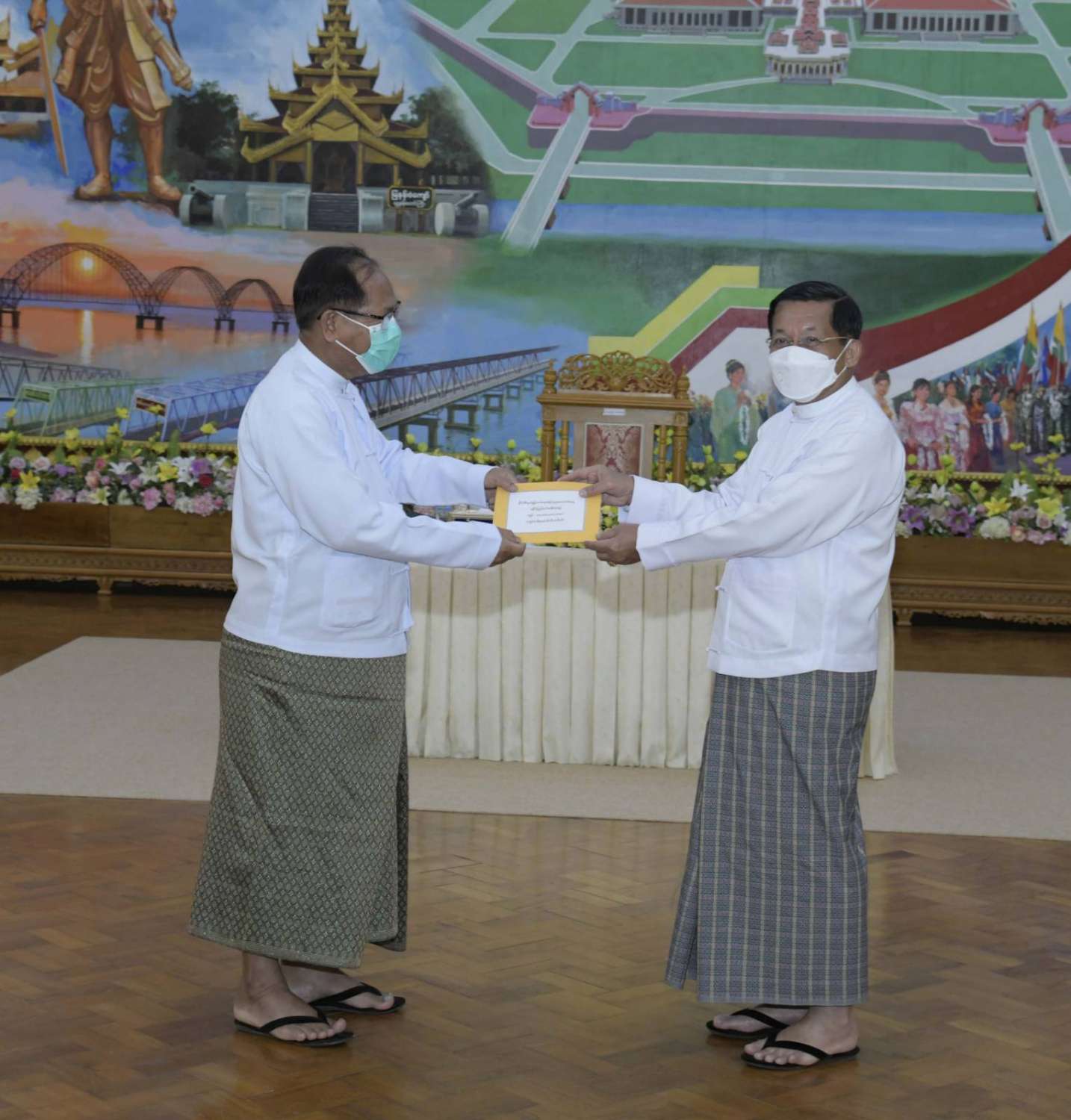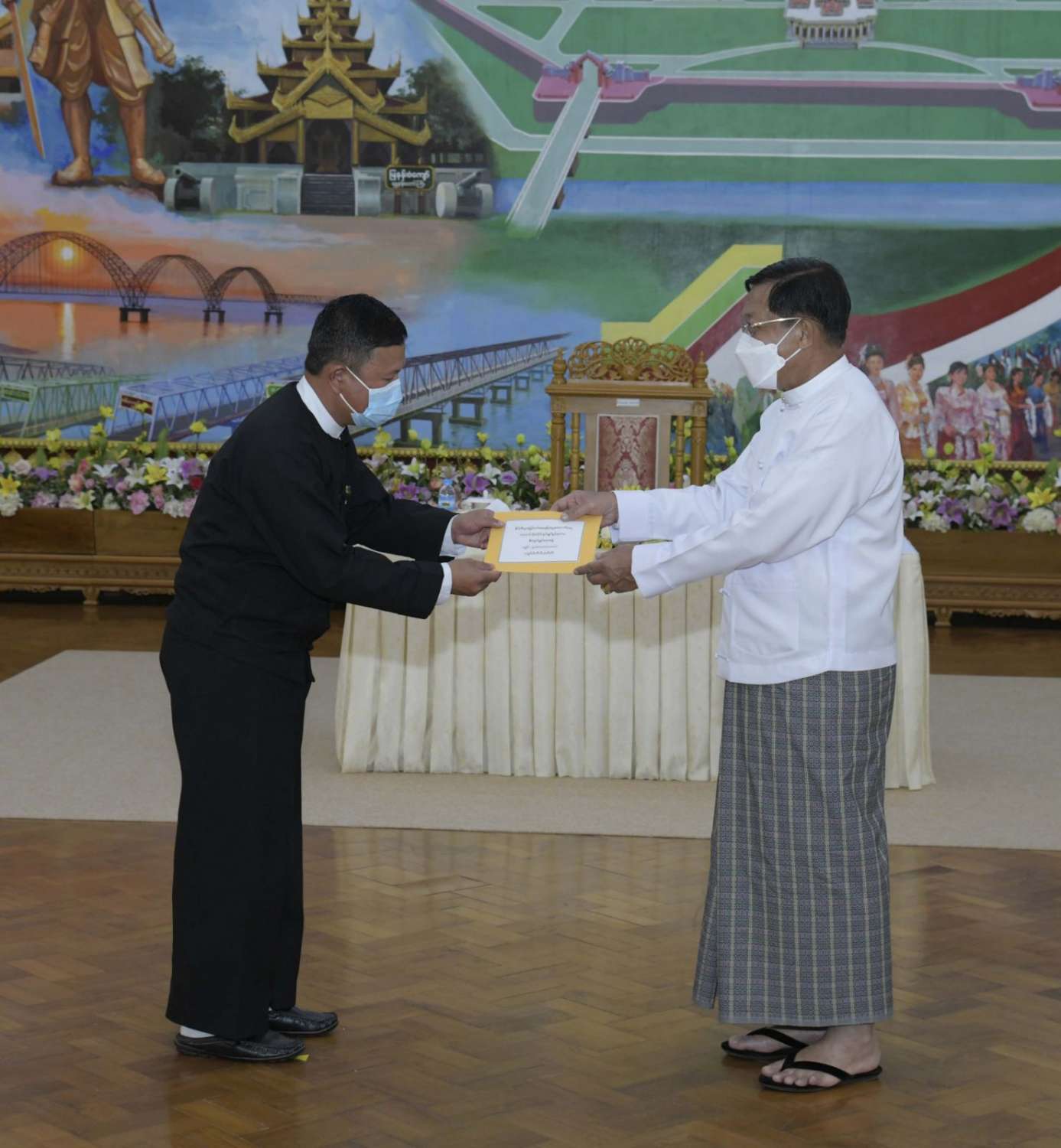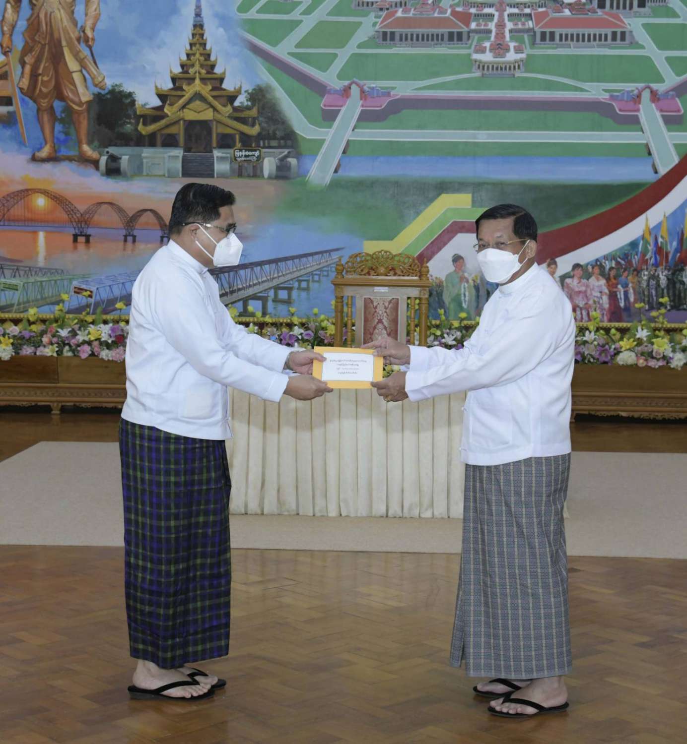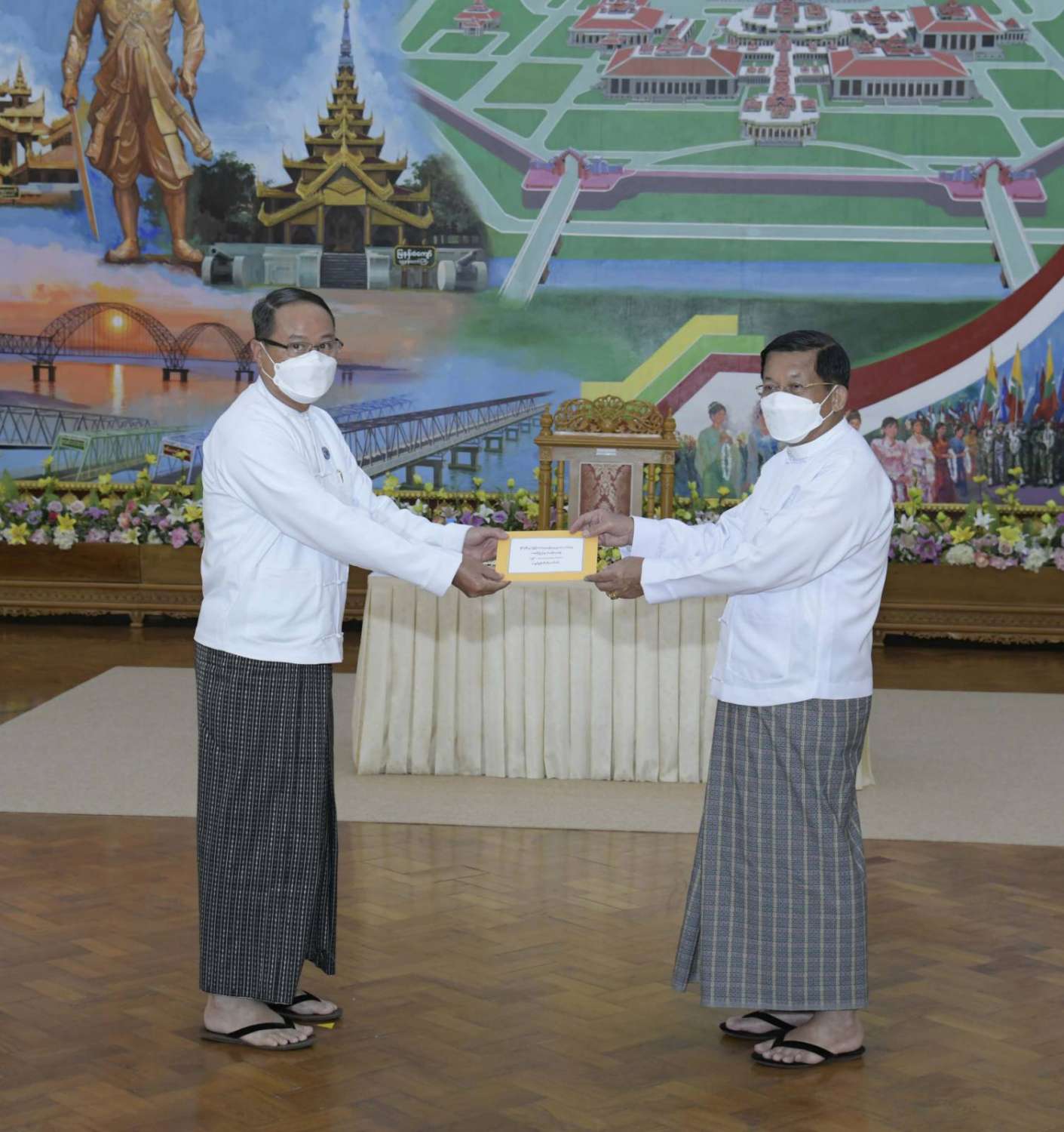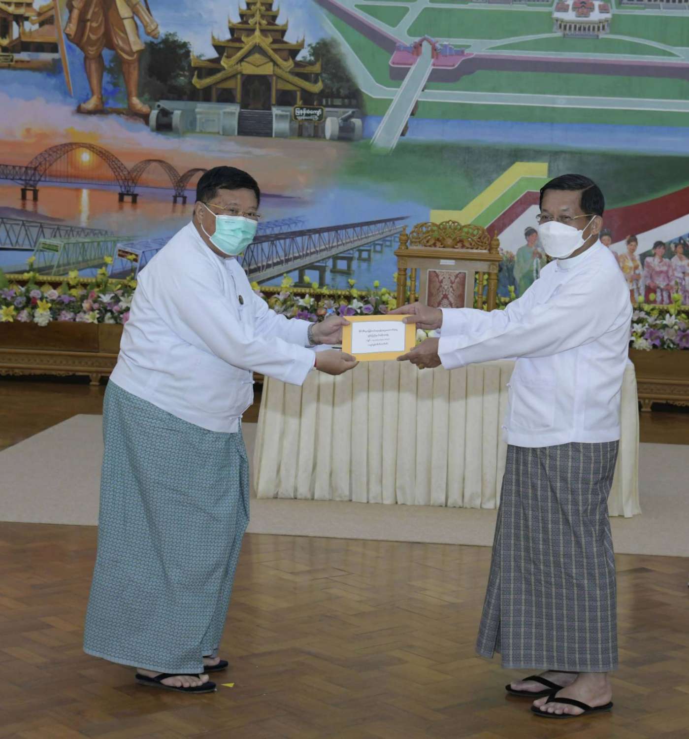 ထို့နောက် နိုင်ငံတော်စီမံအုပ်ချုပ်ရေးကောင်စီဥက္ကဋ္ဌ နိုင်ငံတော်ဝန်ကြီးချုပ်က နိုင်ငံ့စီးပွား မြှင့်တင်ရေး ရန်ပုံငွေမှ ထောက်ပံ့ငွေကို ပေးအပ်ရာ စိုက်ပျိုးရေး၊ မွေးမြူရေးနှင့် ဆည်မြောင်း ဝန်ကြီးဌာန ပြည်ထောင်စုဦးတင်ထွဋ်ဦး၊ သမဝါယမနှင့် ကျေးလက်ဖွံ့ဖြိုးရေးဝန်ကြီးဌာန ပြည်ထောင်စုဝန်ကြီး ဦးလှမိုး၊ ကချင်ပြည်နယ်၊ ကယား ပြည်နယ်၊ ကရင်ပြည်နယ်၊ ချင်းပြည်နယ်၊ တနင်္သာရီတိုင်းဒေသကြီး၊ မွန်ပြည်နယ်၊ ရခိုင်ပြည်နယ်၊ ရှမ်းပြည်နယ် အစိုးရအဖွဲ့တို့မှ ဝန်ကြီးချုပ်များ၊ နာဂ၊ ဓနု၊ ပအိုဝ့်၊ ပလောင်၊ ကိုးကန့် ကိုယ်ပိုင် အုပ်ချုပ်ခွင့်ရဒေသတို့နှင့် “ဝ” ကိုယ်ပိုင်အုပ်ချုပ်ခွင့်ရတိုင်း စီမံအုပ်ချုပ်ရေး အဖွဲ့တို့မှ ဥက္ကဋ္ဌများက အသီးသီး လက်ခံရယူကြသည်။