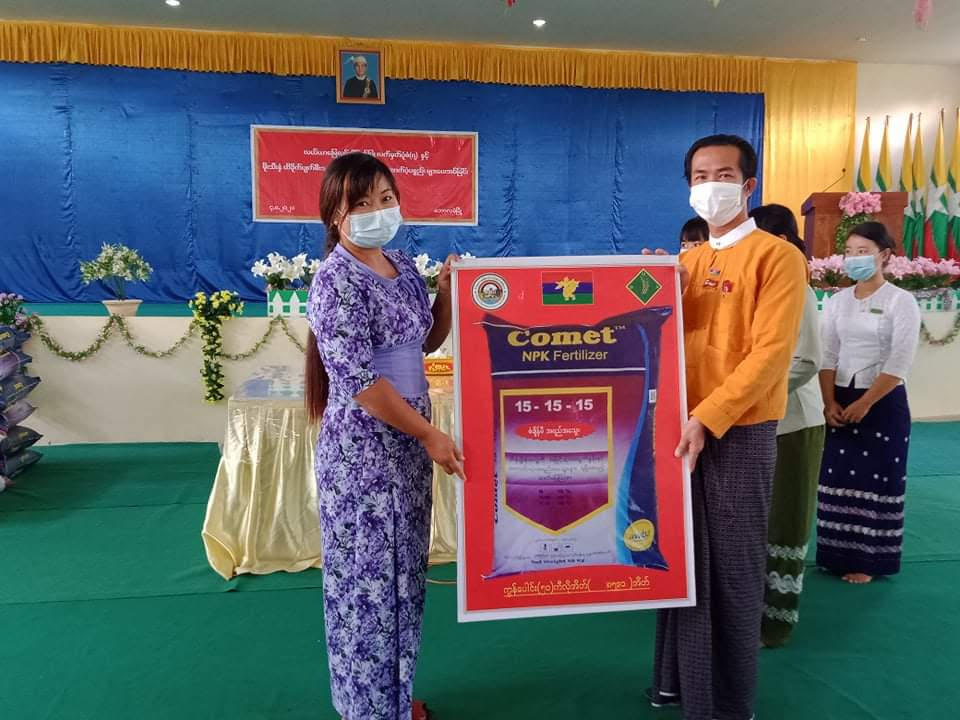 ဆက်လက်ပြီး ပြည်နယ်ဝန်ကြီးချုပ်၊ပြည်နယ်အစိုးရအဖွဲ့ဝင် ဝန်ကြီးများ ပြည်နယ်အစိုးရရုံး အတွင်းရေးမှူးနှင့်ပြည်နယ်အဆင့် ဌာနဆိုင်ရာ တာဝန်ရှိသူများက လယ်ယာလုပ်ပိုင်ခွင့်လက်မှတ် ပုံစံ(၇)ပြန်လည်ရရှိသူ တောင်သူ(၆)ဦး၊ သဘာဝဘေးကြောင့် နှမ်းသီးနှံပျက်စီးဆုံးရှုံးထားသည့် တောင်သူ(၃၁)တို့အား ဓါတ်မြေဩဇာ၊ ပိုးသတ်ဆေးနှင့် ဟင်းသီးဟင်းရွက် မျိုးစေ့များကို အသီးသီး ပေးအပ်ခဲ့ကြသည်။