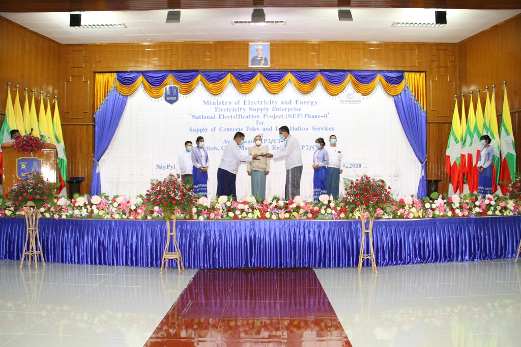 အမျိုးသားလျှပ်စစ်ဓာတ်အားရရှိရေးစီမံကိန်း ဒုတိယအဆင့်ကျေးရွာများအတွက် ကွန်ကရစ်တိုင်ဝယ်ယူရေး နှင့် တည်ဆောက်ရေးလုပ်ငန်းအပ်နှံရန် တင်ဒါအောင်မြင်ခဲ့သော ကုမ္ပဏီများနှင့် စာချုပ်လဲလှယ်ခြင်း အခမ်းအနား ကျင်းပ