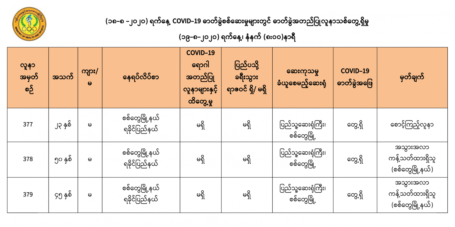 ၂။ (၁၉-၈-၂၀၂၀)ရက်နေ့၊ နံနက် (၈:၀၀) နာရီအထိ မြန်မာနိုင်ငံတွင် COVID-19 ရောဂါ ဓာတ်ခွဲအတည်ပြုလူနာ (၃၇၉)ဦး ရှိပါသည်။
