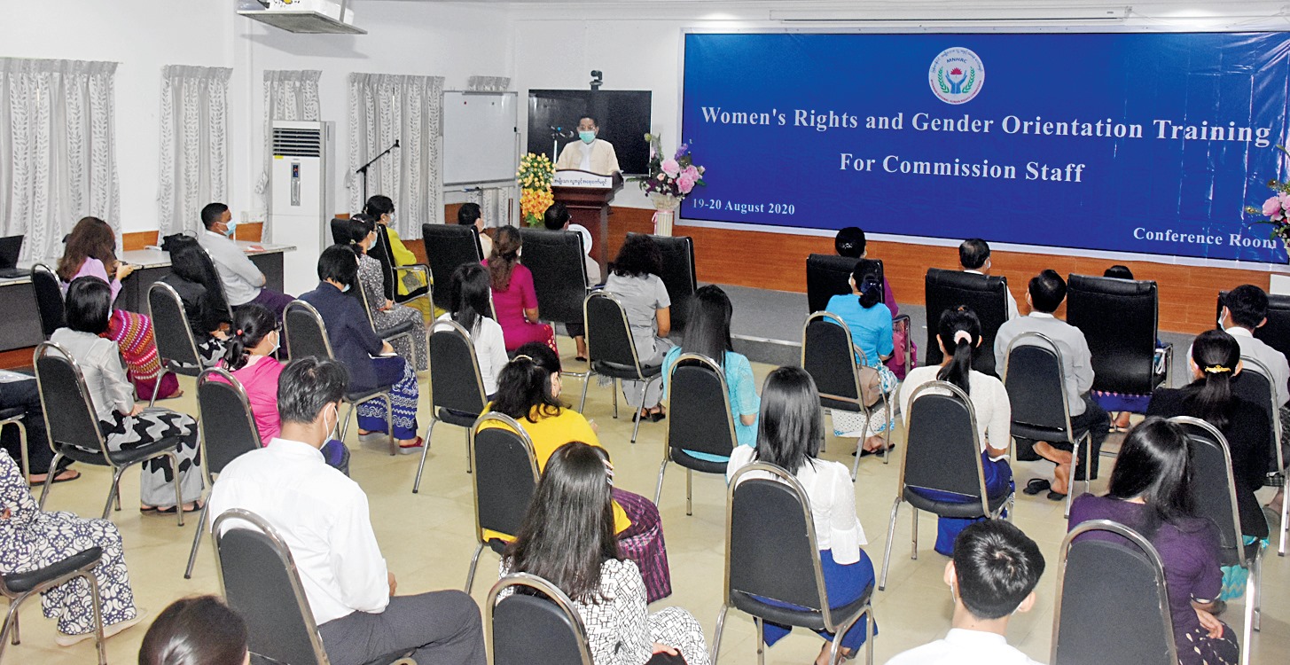မြန်မာနိုင်ငံ အမျိုးသားလူ့အခွင့်အရေး ကော်မရှင်နှင့် Triangle Women Organization တို့ ပူးပေါင်းပြီး Women’s Rights and Gender Orientation Training အလုပ်ရုံ သင်တန်းဖွင့်ပွဲကို ယနေ့ နံနက် ၉ နာရီ ခွဲက ရန်ကုန်မြို့ ၆ မိုင်ခွဲရှိ မြန်မာနိုင်ငံ အမျိုးသားလူ့အခွင့်အရေး ကော်မရှင်ရုံး၌ ပြုလုပ်သည်။