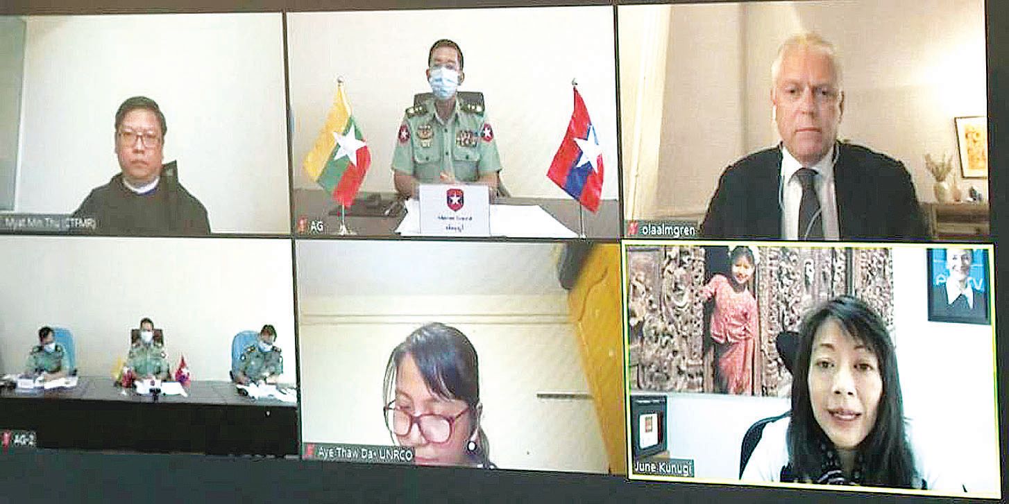 အရွယ်မရောက်သေးသူ ကလေးသူငယ်များအား စစ်မှုထမ်းခြင်းမှ ကာကွယ်တားဆီးရေးကိစ္စနှင့်စပ်လျဉ်း၍ ယမန်နေ့နံနက်ပိုင်းက Video Conference ဖြင့်ကျင်းပရာ ကာကွယ်ရေးဦးစီးချုပ်ရုံး (ကြည်း)မှ စစ်ရေးချုပ် ဒုတိယဗိုလ်ချုပ်ကြီး မျိုးဇော်သိန်းနှင့် တပ်မတော်အရာရှိကြီးများ၊ CTFMR ပူးတွဲဥက္ကဋ္ဌများ ဖြစ်ကြသည့် မြန်မာနိုင်ငံဆိုင်ရာကုလသမဂ္ဂဌာနေညှိနှိုင်းရေးမှူး Mr. Ola Almgren၊ မြန်မာ နိုင်ငံဆိုင်ရာယူနီဆက်ကိုယ်စားလှယ် Ms. June Kunugi နှင့် တာဝန်ရှိသူများ တက်ရောက်ကြသည်။