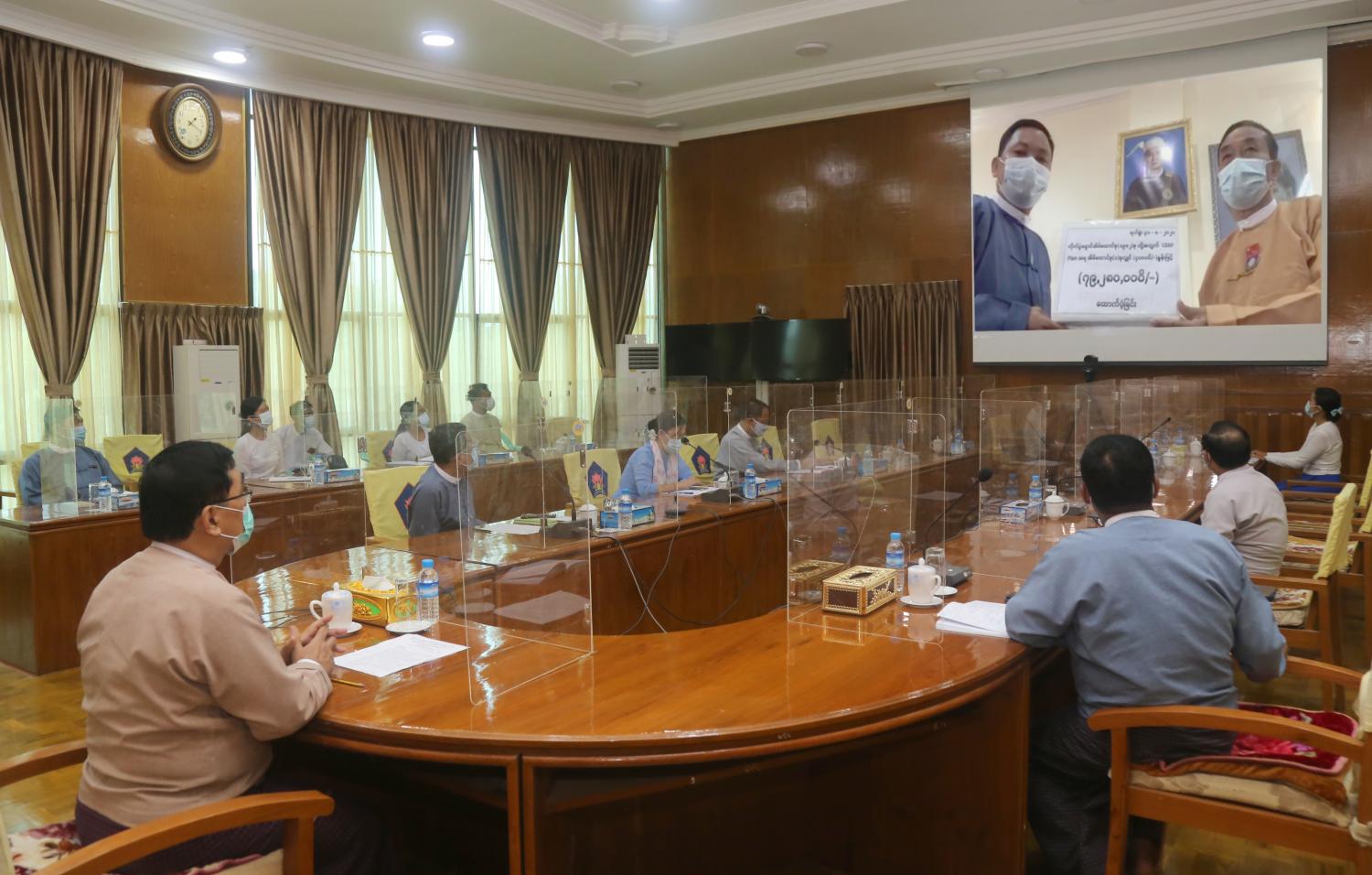 ချင်းပြည်နယ်၊ ပလက်ဝမြို့နယ်နှင့် ဆမီးမြို့တို့ရှိ တိုက်ပွဲရှောင်အိမ်ထောင်စုများ၊ အသက် (၈၀) နှင့်အထက် (၈၅) နှစ်အောက် ဘိုးဘွားများ အတွက် ကိုဗစ်-၁၉ စီးပွားရေး ကုစားမှု အစီအစဉ်အရ ထောက်ပံ့ငွေများ လွှဲပြောင်းပေးအပ်ခြင်းနှင့် ဘေးအန္တရာယ် ဆိုင်ရာ စီမံခန့်ခွဲမှု ဦးစီးဌာနက ပုံမှန်စားနပ်ရိက္ခာထောက်ပံ့မှု အစီအစဉ်အရ ပလက်ဝမြို့နယ်၊ တိန်းလက်ဝကျေးရွာရှိ တိုက်ပွဲရှောင် သူများအတွက် စားနပ်ရိက္ခာ (၃)လစာ လွှဲပြောင်းပေးအပ်ခြင်း အခမ်းအနားကို လူမှုဝန်ထမ်း၊ ကယ်ဆယ်ရေးနှင့် ပြန်လည်နေရာချထားရေး ဝန်ကြီးဌာန ယနေ့မွန်းလွဲပိုင်းတွင် Video Conferencing စနစ်ဖြင့် ကျင်းပသည်။