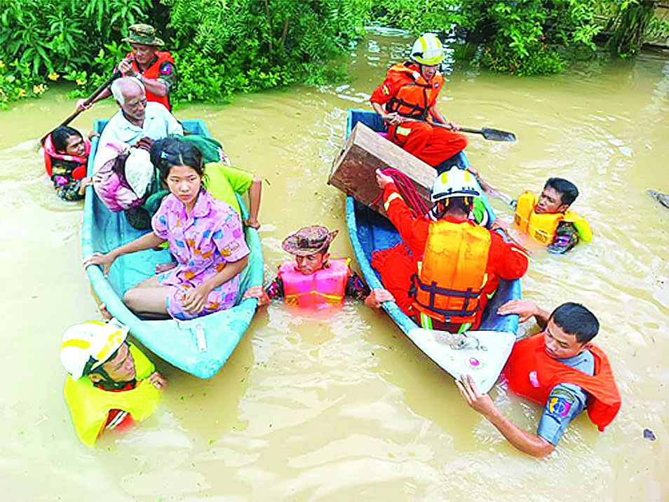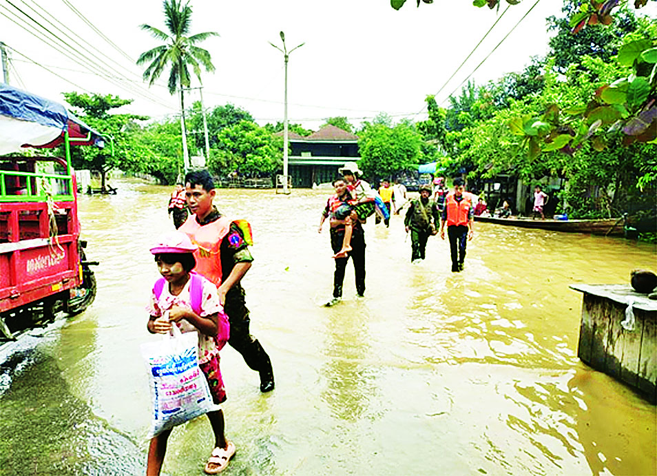 ယနေ့မွန်းတည့် ၁၂ နာရီတွင် မြစ်ရေပြန်လည်ကျဆင်းခဲ့သဖြင့် မြို့တွင်းလမ်းများပေါ်၌အမှိုက်များ၊ ဒိုက်များ၊ နုန်းများ တင်ကျန်လျက်ရှိရာ မြောက်ပိုင်းတိုင်းစစ်ဌာနချုပ်မှ နယ်မြေခံတပ်မတော်သားများ၊ မီးသတ်တပ်ဖွဲ့ဝင်များ၊ လူမှုကူညီရေးအသင်းအဖွဲ့များ၊ ဌာနဆိုင်ရာဝန်ထမ်းများက ရေဝင်ရောက်မှုများ ဖြစ်ပေါ်လျက်ရှိသည့် ရပ်ကွက်၊ ကျေးရွာများအတွင်း စုပေါင်းသန့်ရှင်းရေးလုပ်ငန်းများ ဆောင်ရွက်ပေးသည်။