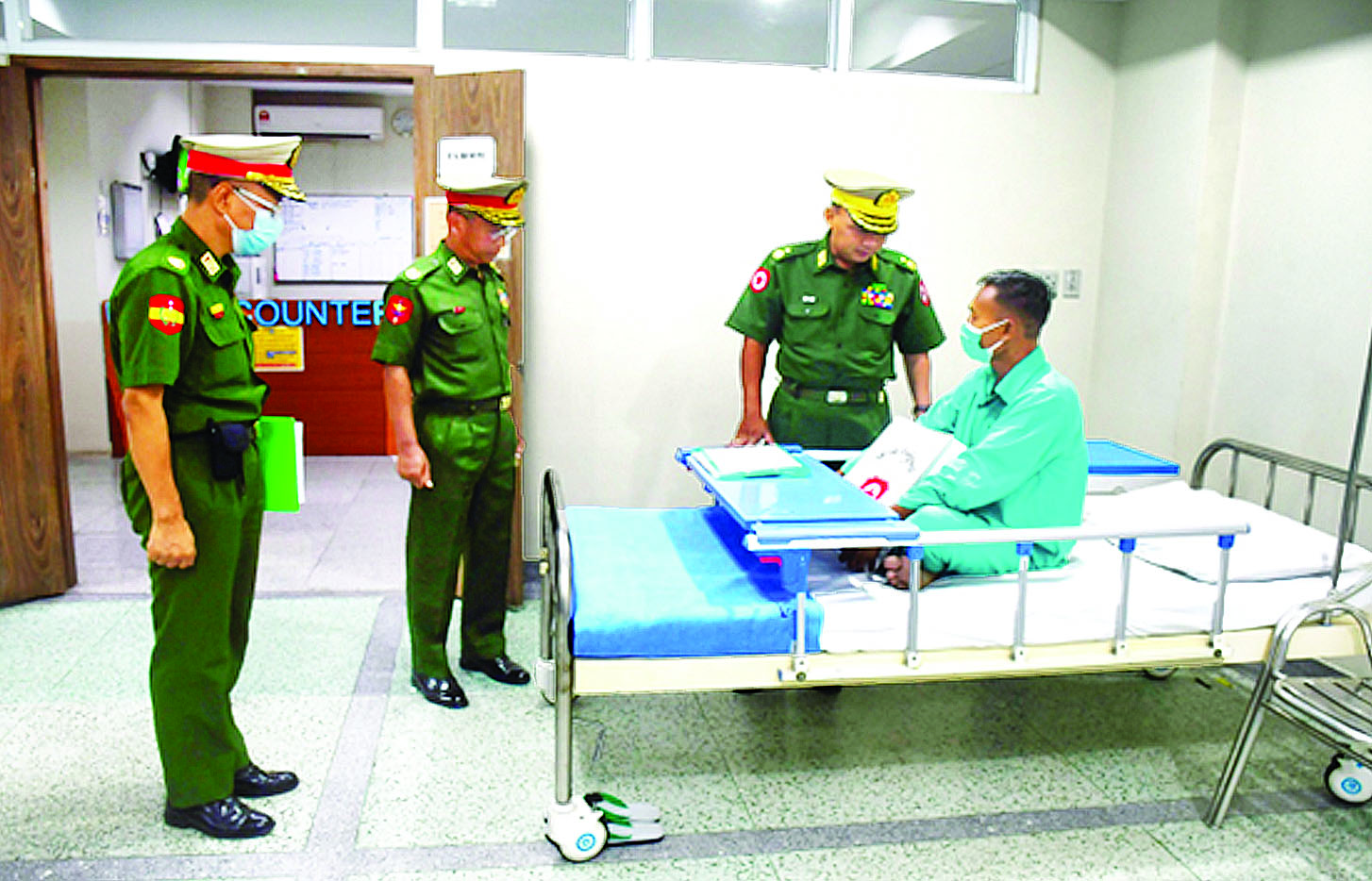 ရန်ကုန်တိုင်းဒေသကြီး မင်္ဂလာဒုံမြို့နယ်ရှိ တပ်မတော်အရိုးရောဂါအထူးကုဆေးရုံကြီး (ခုတင်-၅၀၀) နှင့် တပ်မတော်ဆေးရုံကြီး (ခုတင်-၁၀၀၀) တို့၌ တက်ရောက်ကုသမှုခံယူလျက်ရှိသော အရာရှိ၊ စစ်သည်၊ မိသားစုများအား ယနေ့နံနက်ပိုင်းတွင် ရန်ကုန်တိုင်းစစ်ဌာနချုပ် တိုင်းမှူး ဗိုလ်ချုပ်ဇော်ဟိန်းနှင့် တာဝန်ရှိသူများက သွားရောက်ကြည့်ရှု၍ တစ်ဦးချင်း၏ ရောဂါဖြစ်ပွားမှု၊ ဆေးဝါးကုသပေးထားမှုနှင့် ကျန်းမာရေးတိုးတက်ကောင်းမွန်မှုအခြေအနေများကို ရင်းရင်းနှီးနှီး မေးမြန်းအားပေးစကားပြောကြားပြီး စားသောက်ဖွယ်ရာများ ပေးအပ်သည်။