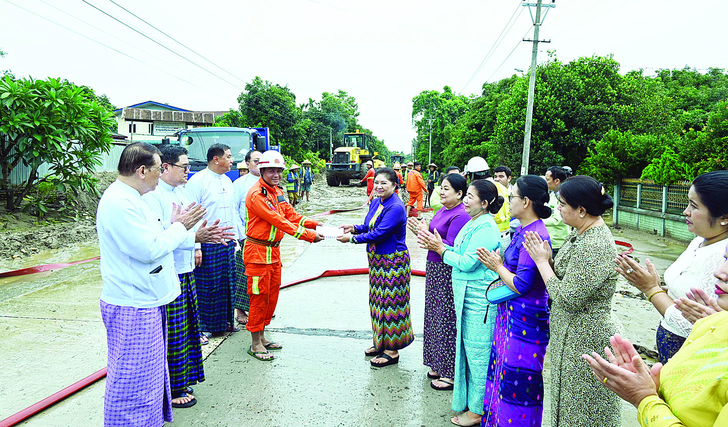 ထို့နောက် နိုင်ငံတော်စီမံ အုပ်ချုပ်ရေးကောင်စီအဖွဲ့ဝင်၊ ပြည်နယ်ဝန်ကြီးချုပ်နှင့် တာဝန်ရှိ သူများသည် မြစ်ကြီးနားမြို့ လယ်ကုန်းရပ်ကွက်အတွင်း မြစ်ရေမြင့်တက်မှုကြောင့် နုန်းမြေများ တင်ကျန်နေမှုကို လမ်းဦးစီးဌာန၊ စည်ပင်သာယာရေးအဖွဲ့ဝင်များနှင့် မီးသတ်တပ်ဖွဲ့ဝင်များ စုပေါင်း၍ စက်ယန္တရားများဖြင့် နုန်းမြေများ ဖယ်ရှားရှင်းလင်းနေမှုအခြေအနေများကို သွားရောက်ကြည့်ရှုအားပေးကြပြီး ဝန်ထမ်းများအတွက် ထောက်ပံ့ချီးမြှင့်ငွေများကို ပေးအပ်ချီးမြှင့်ခဲ့ကြကြောင်း သိရသည်။