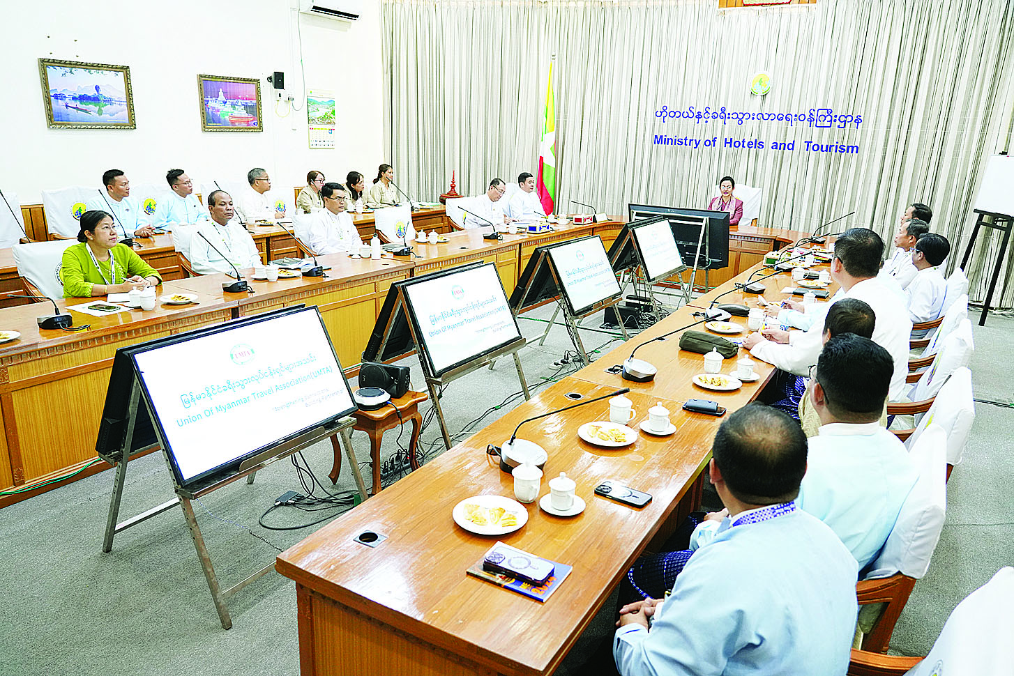 ထို့နောက် မြန်မာနိုင်ငံခရီးသွားလုပ်ငန်းရှင်များအသင်းဥက္ကဋ္ဌ ဦးကျော်ဘုန်းနိုင်က ၎င်းတို့အသင်း၏ ဖွဲ့စည်းမှုနှင့် လုပ်ငန်းတာဝန်များ၊ Myanmar International Travel Mart (2025) နှင့် Myanmar International Travel Expo (2026) အကောင်အထည်ဖော်ဆောင်ရွက်မည့်အခြေအနေများ၊ ခရီးသွားလုပ်ငန်းဖွံ့ဖြိုးတိုးတက်ရေး ဆောင်ရွက်ခဲ့မှုအခြေအနေများနှင့် ရှေ့ဆက်လက်ဆောင်ရွက်မည့်လုပ်ငန်းစဉ်များကို ရှင်းလင်းတင်ပြပြီး ဟိုတယ်နှင့်ခရီးသွားလာရေးဝန်ကြီးဌာနမှ အမြဲတမ်းအတွင်းဝန်၊ ညွှန်ကြားရေးမှူးချုပ်နှင့် တက်ရောက်လာကြသူများက လိုအပ်သည်များကို ဖြည့်စွက်အကြံပြုဆွေးနွေးတင်ပြကြရာ ပြည်ထောင်စုဝန်ကြီးနှင့် ဒုတိယဝန်ကြီးတို့က တင်ပြချက်များအပေါ် ပေါင်းစပ်ညှိနှိုင်းဆောင်ရွက်ပေးခဲ့ကြောင်းသိရသည်။